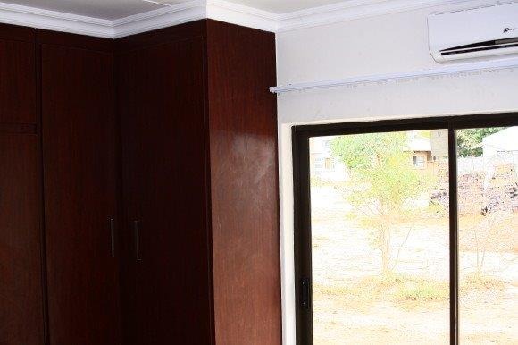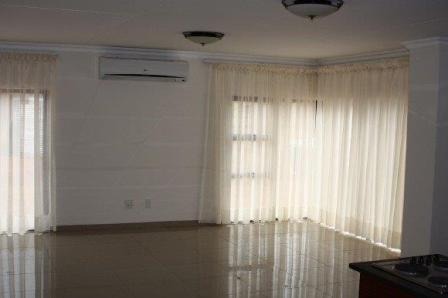 Step inside to bright, inviting interiors characterized by sleek tiled flooring, neutral wall tones, and elegant crown molding. The spacious layout includes a comfortable lounge, a dedicated dining room, and a functional kitchen, all designed for modern living. Large windows, often adorned with sheer curtains, allow ample sunlight to illuminate each space, creating an airy and open atmosphere. Air conditioning units are installed for climate control.