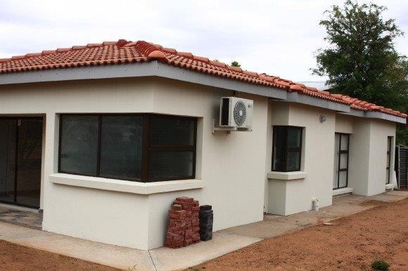 Discover this modern single-story residence, boasting a contemporary design with a striking red tiled roof and light-coloured exterior walls. The property presents excellent kerb appeal, featuring an integrated double garage with an attractive wooden-look door and a neatly paved driveway, ensuring convenient access. Large sliding glass doors enhance the facade, inviting natural light into the home.
