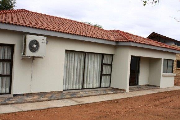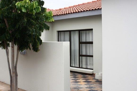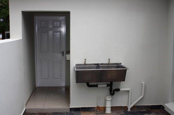 Outside, enjoy a private checkered tiled patio area, perfect for relaxation or entertaining. The property is situated within an eco estate, offering a lifestyle connected to nature. Practical features include a utility sink area and a satellite dish for connectivity.