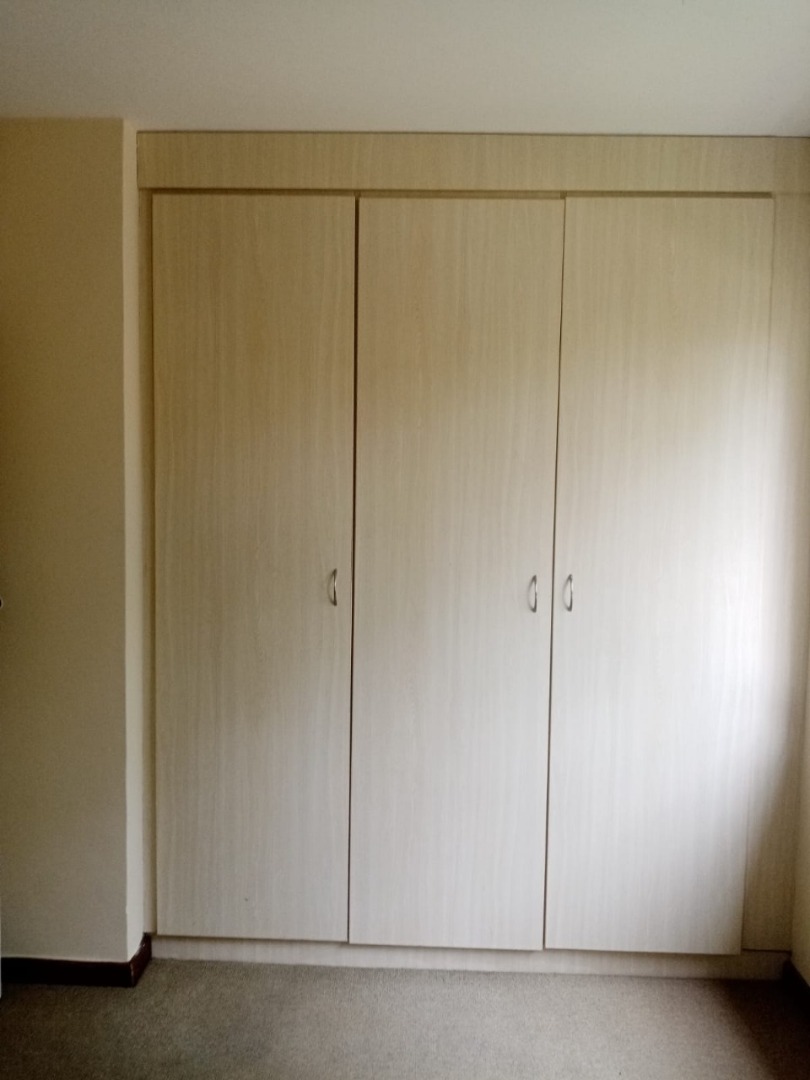 This residence features two spacious bedrooms, each benefiting from its own en-suite bathroom, offering privacy and convenience. Integrated storage solutions, including floor-to-ceiling wardrobes with a light wood finish, provide ample space for personal belongings, maintaining a clean and uncluttered living environment.