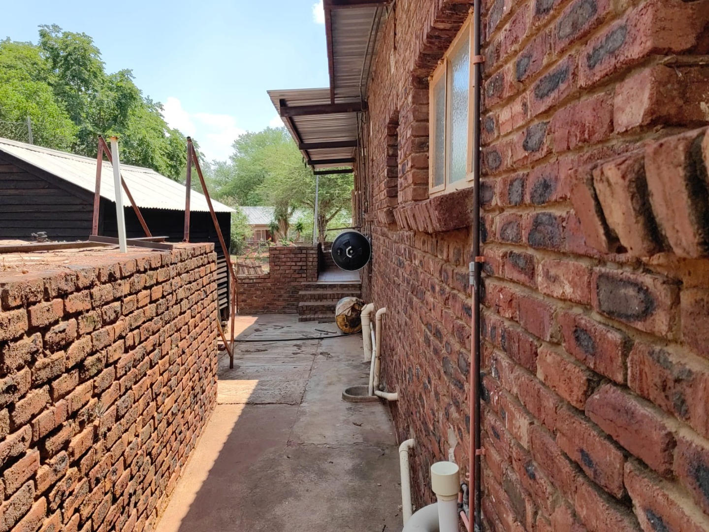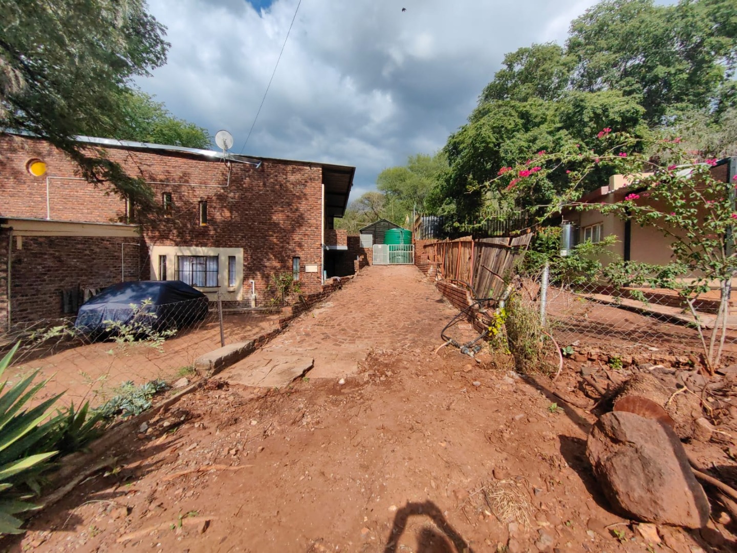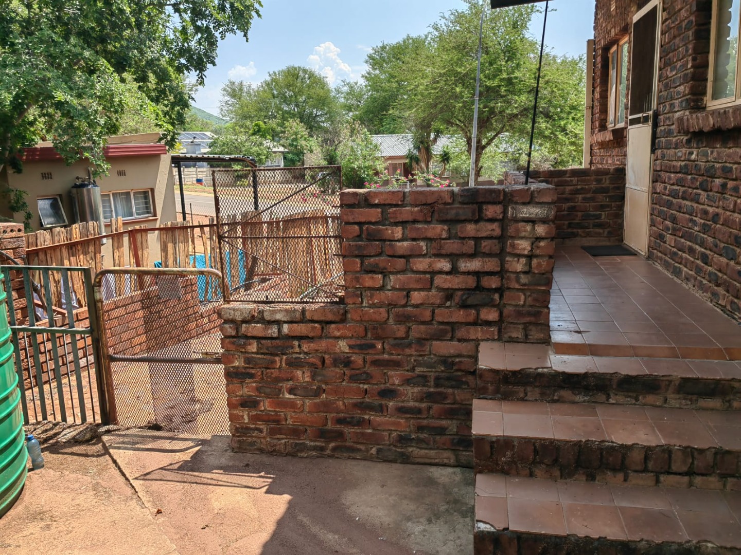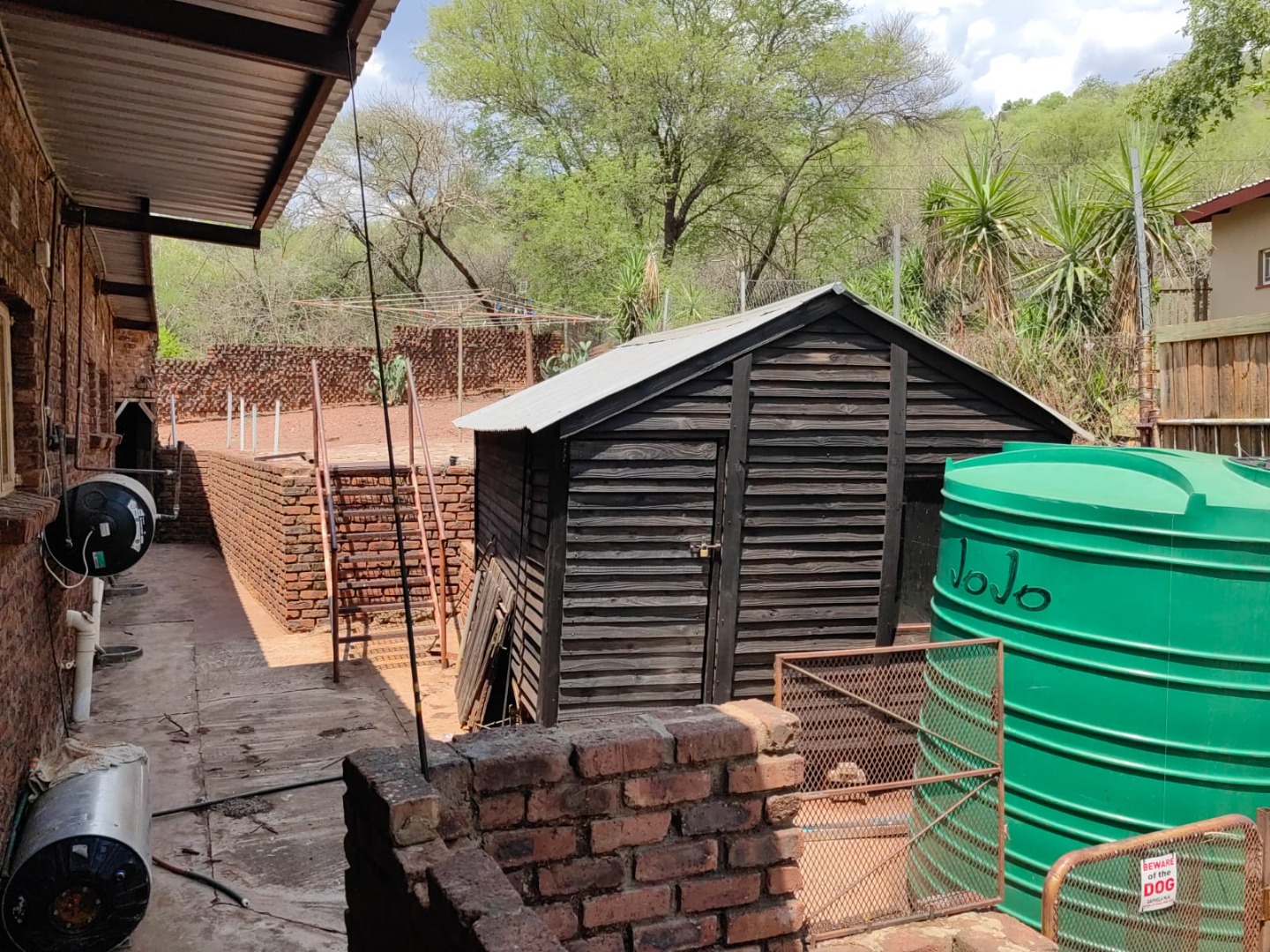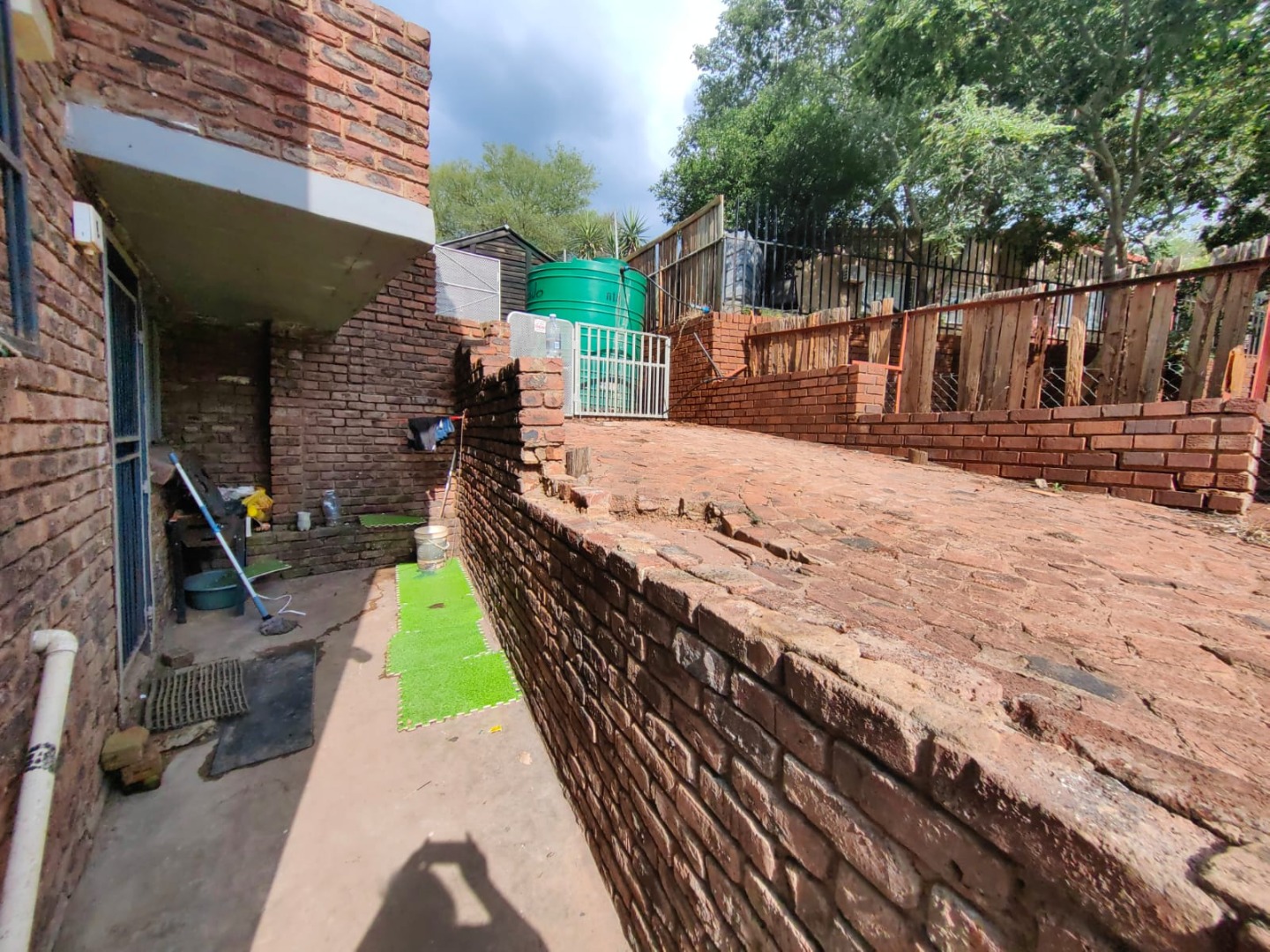 This is a corner stand where the two back sides of the property are walled, and 2 front sides are fenced. Included is a 5000-litter water tank with a pump.