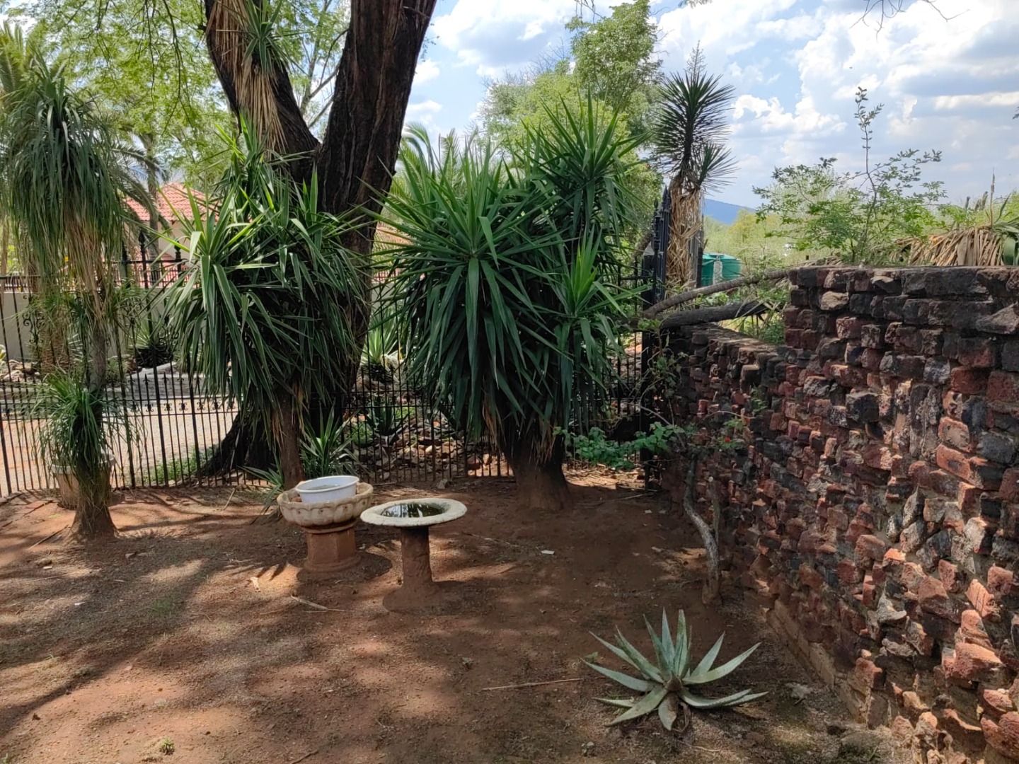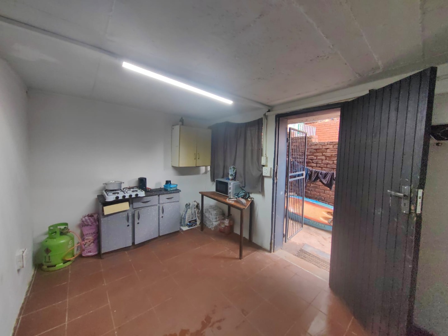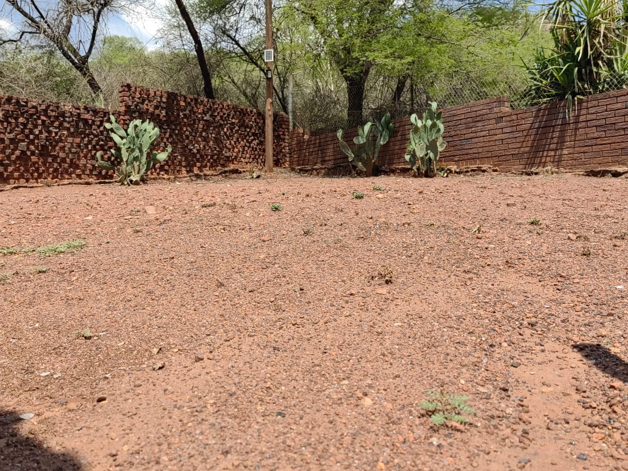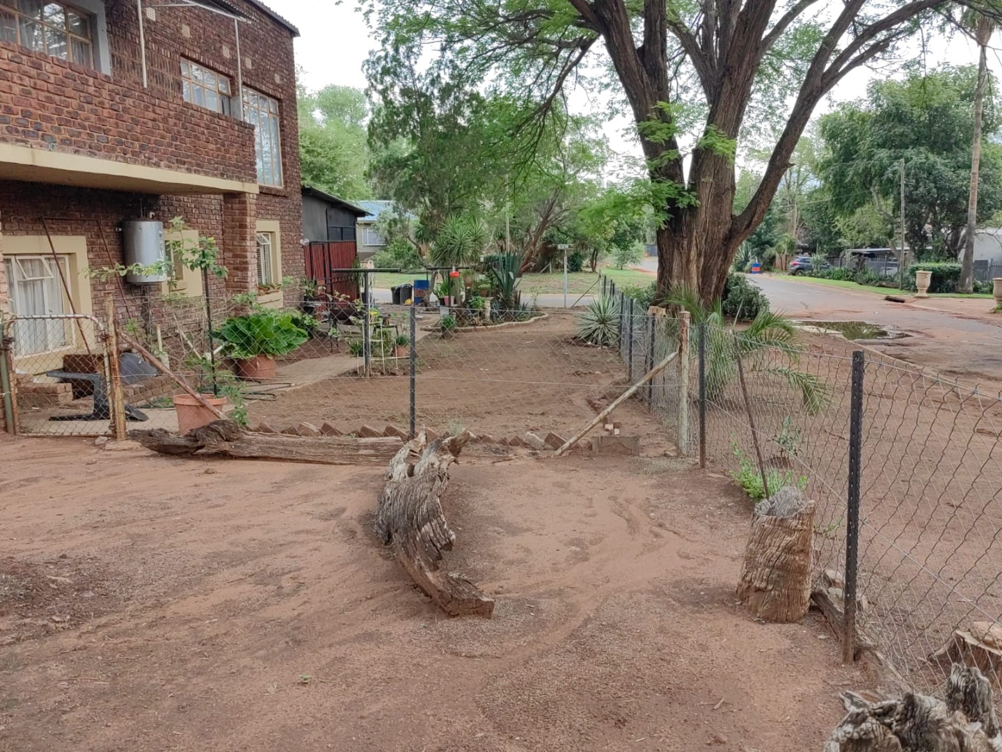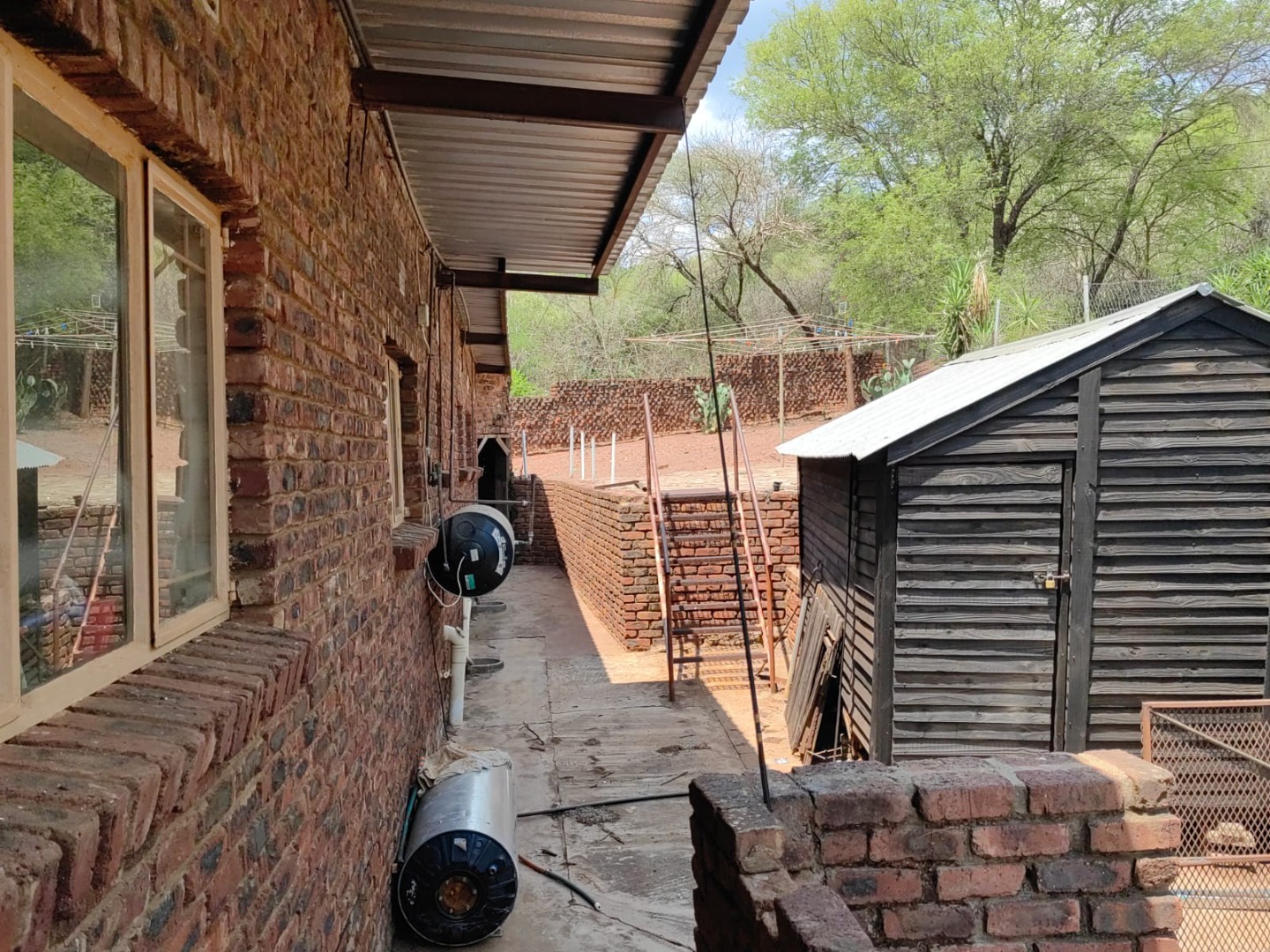 This is a corner stand where the two back sides of the property are walled, and 2 front sides are fenced. Included is a 5000-litter water tank with a pump.