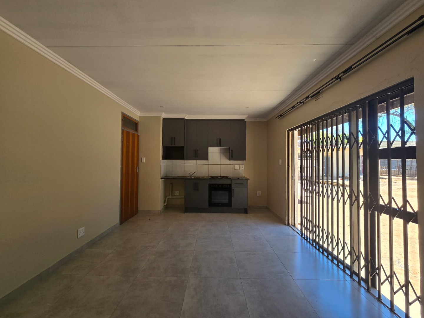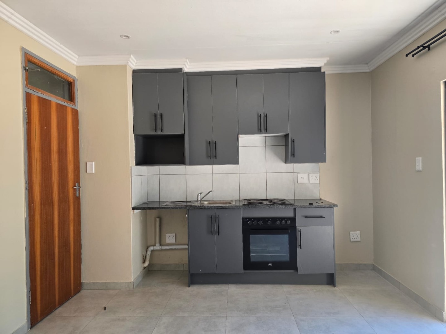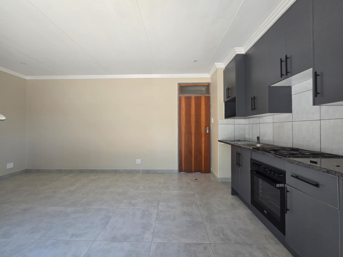 Step inside and you'll find a lovely open-plan living area with a modern kitchenette. It boasts sleek dark grey cabinets, an integrated oven and stove, and a stylish tiled backsplash – perfect for whipping up your favourite meals. The light grey tiled flooring throughout gives the whole place a fresh, clean feel, and the neutral walls mean you can easily add your personal touch.