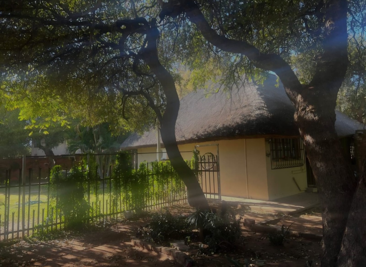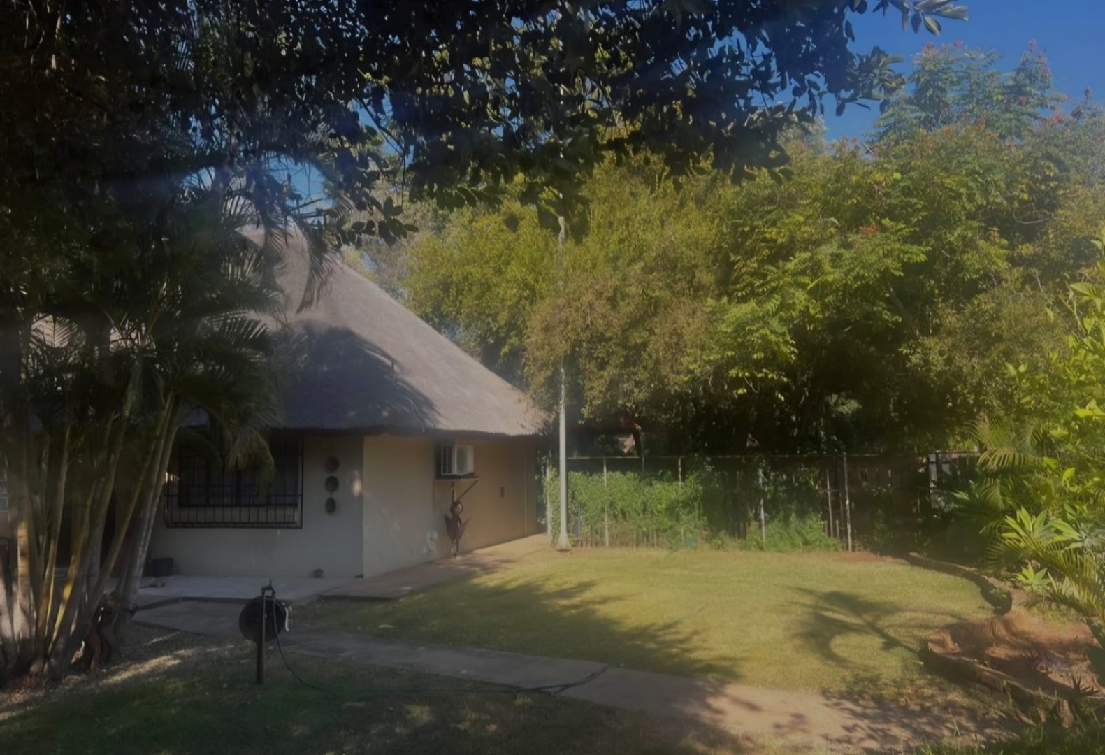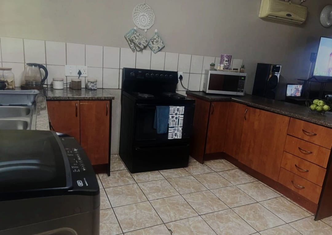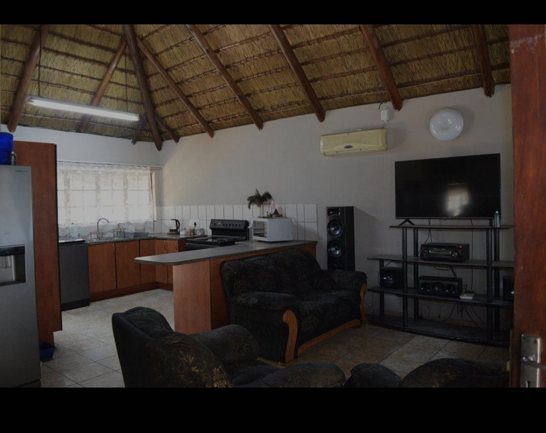 Discover this charming 2-bedroom, 1-bathroom residential rental property in Onverwacht, Lephalale, South Africa. This distinctive home immediately captures attention with its unique thatched roof architecture, offering rustic charm and comfortable living. An inviting open-plan layout seamlessly connects the living spaces, creating an airy and functional environment for daily life. The well-appointed kitchen is equipped with essential appliances including a stove, microwave, and washing machine, complemented by ample wooden cabinetry and practical tiled flooring. The open-plan living area, featuring tiled floors and exposed wooden beams, benefits from an air conditioning unit, ensuring year-round comfort. Both bedrooms are fitted with built-in wooden wardrobes for convenient storage, and the bathroom offers a functional space with a toilet and pedestal sink. Step outside to a private oasis, perfect for relaxation and entertaining. The property includes a refreshing swimming pool, ideal for cooling off during warm days. Mature trees and a well-maintained garden enhance the outdoor experience, offering shade and natural ambiance. A covered patio provides an excellent spot for outdoor dining. For peace of mind, the home is fitted with security bars on windows and a security gate. This rental property is well-suited for individuals or small families seeking a comfortable and unique living experience. Its practical layout and outdoor amenities cater to a relaxed lifestyle. The area is known for its natural beauty and growing infrastructure, making it an attractive location for residents. Key Features: * 2 Bedrooms, 1 Bathroom * Unique Thatched Roof Architecture * Private Swimming Pool * Open-Plan Living Area * Functional Kitchen with Appliances * Air Conditioning * Built-in Wardrobes * Mature Garden & Covered Patio * Security Bars & Gate