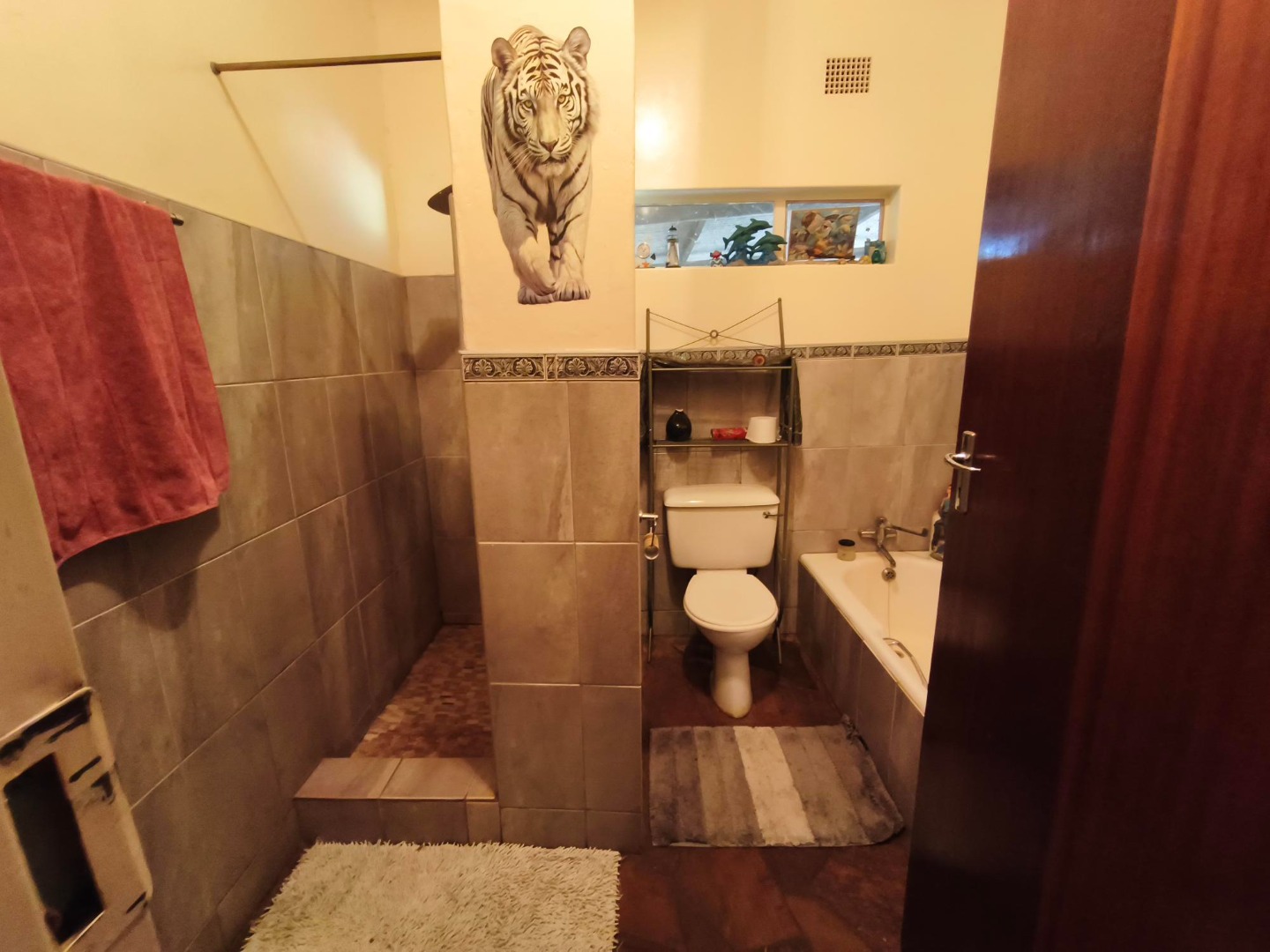 The functional bathroom is tiled and offers both a walk-in shower and a small bathtub, providing dual bathing options.