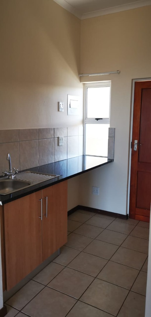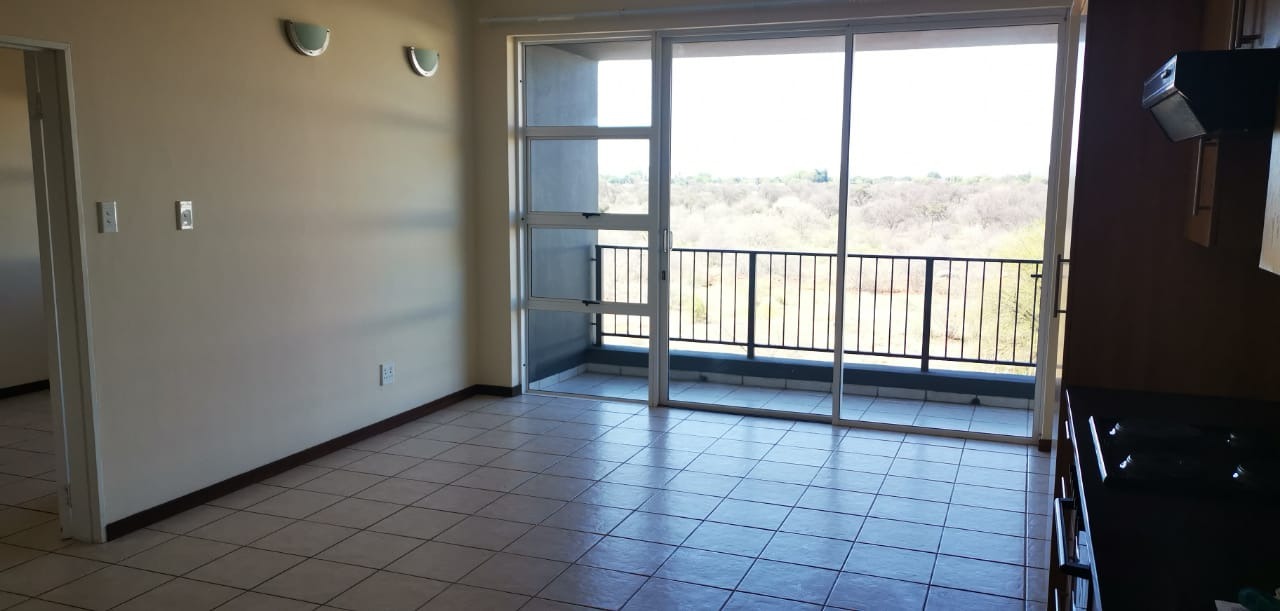 Step inside and you'll find a bright and inviting open-plan living area. The lounge is a great space to relax, featuring easy-to-maintain tiled flooring and neutral walls, ready for your personal touch. Large sliding glass doors let in loads of natural light and lead out to a private balcony, perfect for enjoying the fresh air. The compact kitchenette is practical, with a sink, granite countertop, and light wood-look base cabinets.