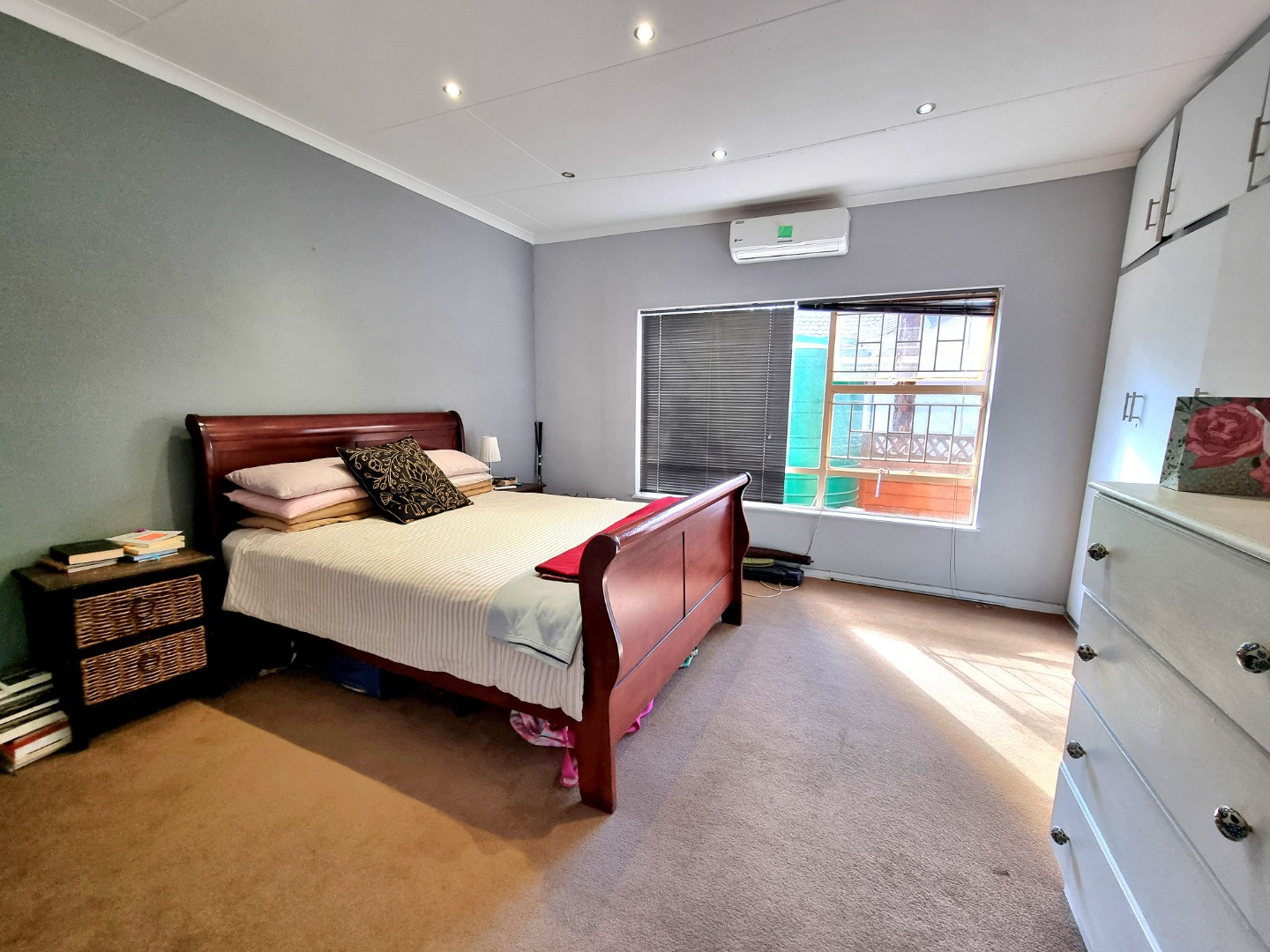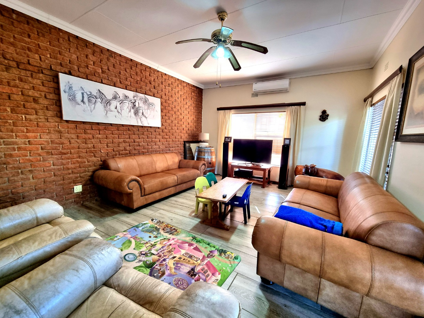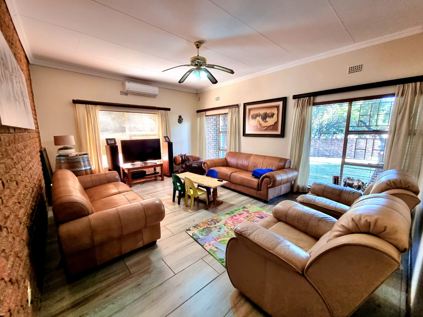 The house includes a TV-room that is air-conditioned and has a ceiling fan. From the dining area, a hallway leads to the bedrooms. The first bedroom is carpeted, with air conditioning and built-in closets. The second bedroom mirrors the first, offering similar features. The main bedroom boasts an Ensuite bathroom with a bath, toilet, and sink. This room also has air conditioning, built-in closets, and is carpeted. The hallway is lined with built-in closets, ending in a guest toilet and a bathroom that includes a bath, sink, and shower.