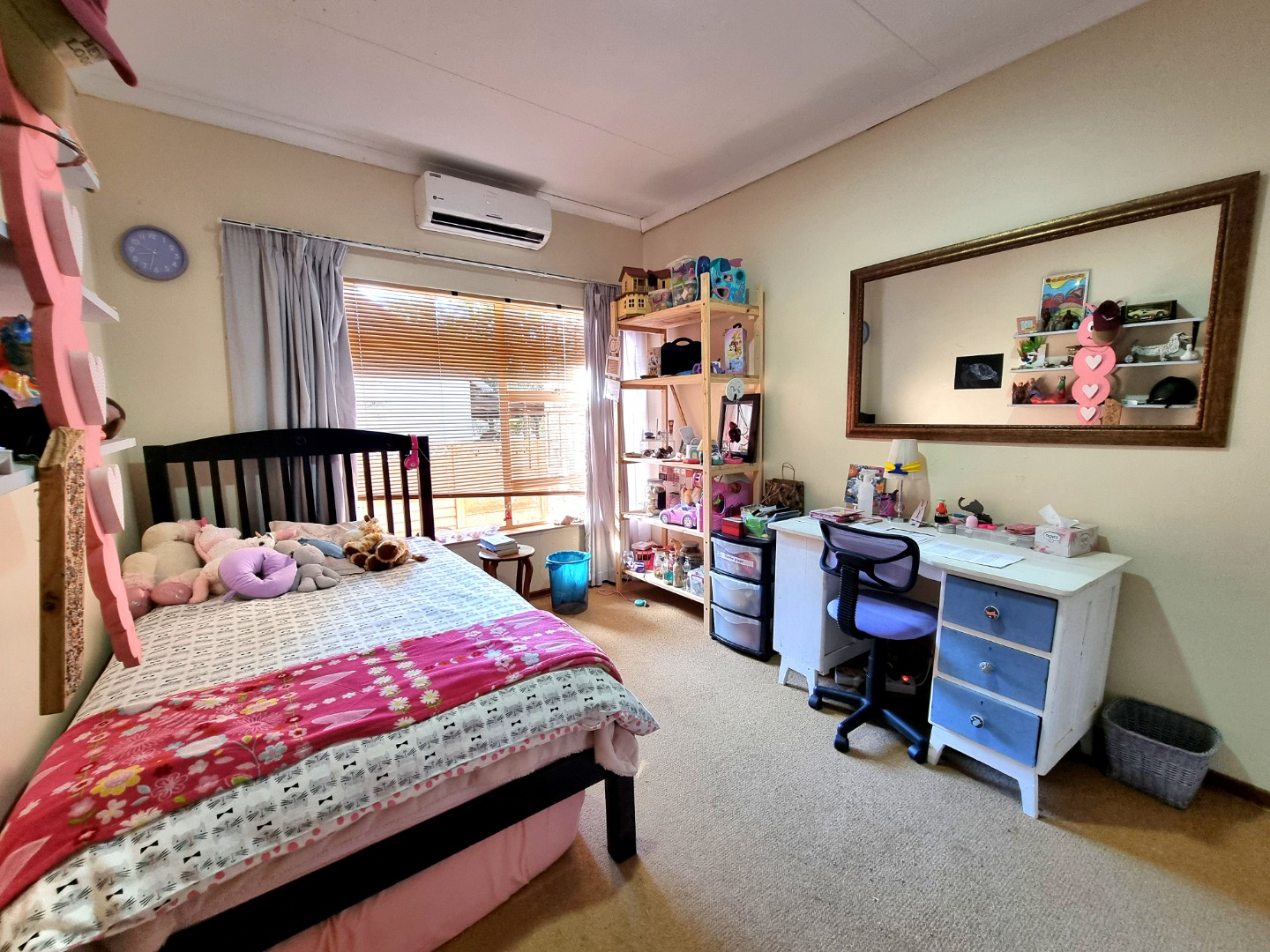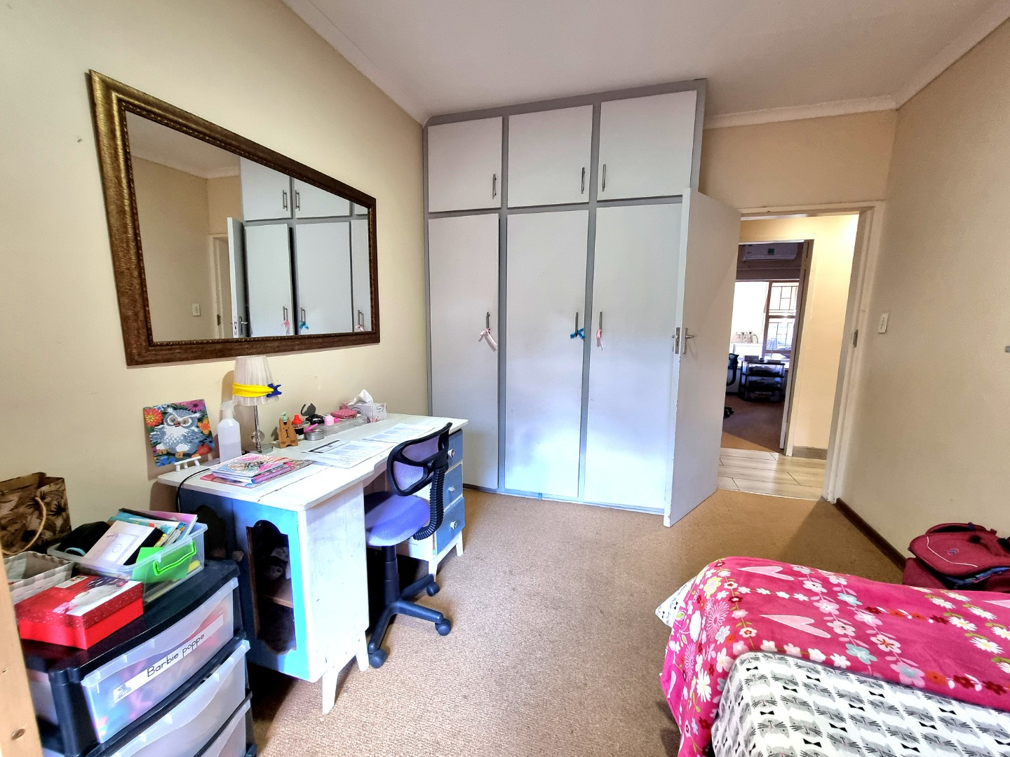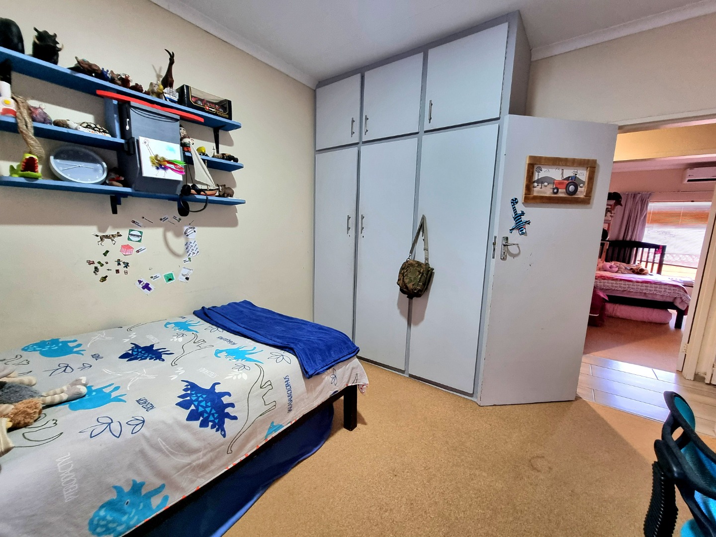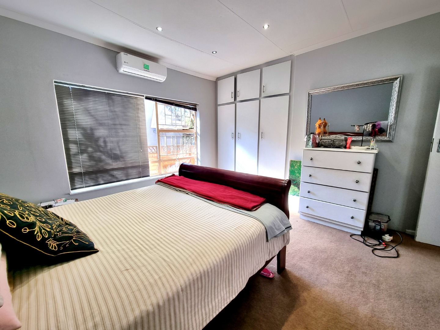 The house includes a TV-room that is air-conditioned and has a ceiling fan. From the dining area, a hallway leads to the bedrooms. The first bedroom is carpeted, with air conditioning and built-in closets. The second bedroom mirrors the first, offering similar features. The main bedroom boasts an Ensuite bathroom with a bath, toilet, and sink. This room also has air conditioning, built-in closets, and is carpeted. The hallway is lined with built-in closets, ending in a guest toilet and a bathroom that includes a bath, sink, and shower.