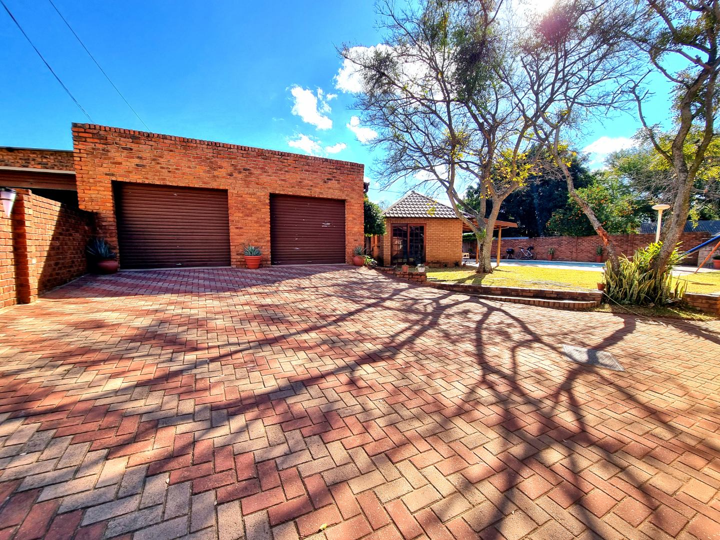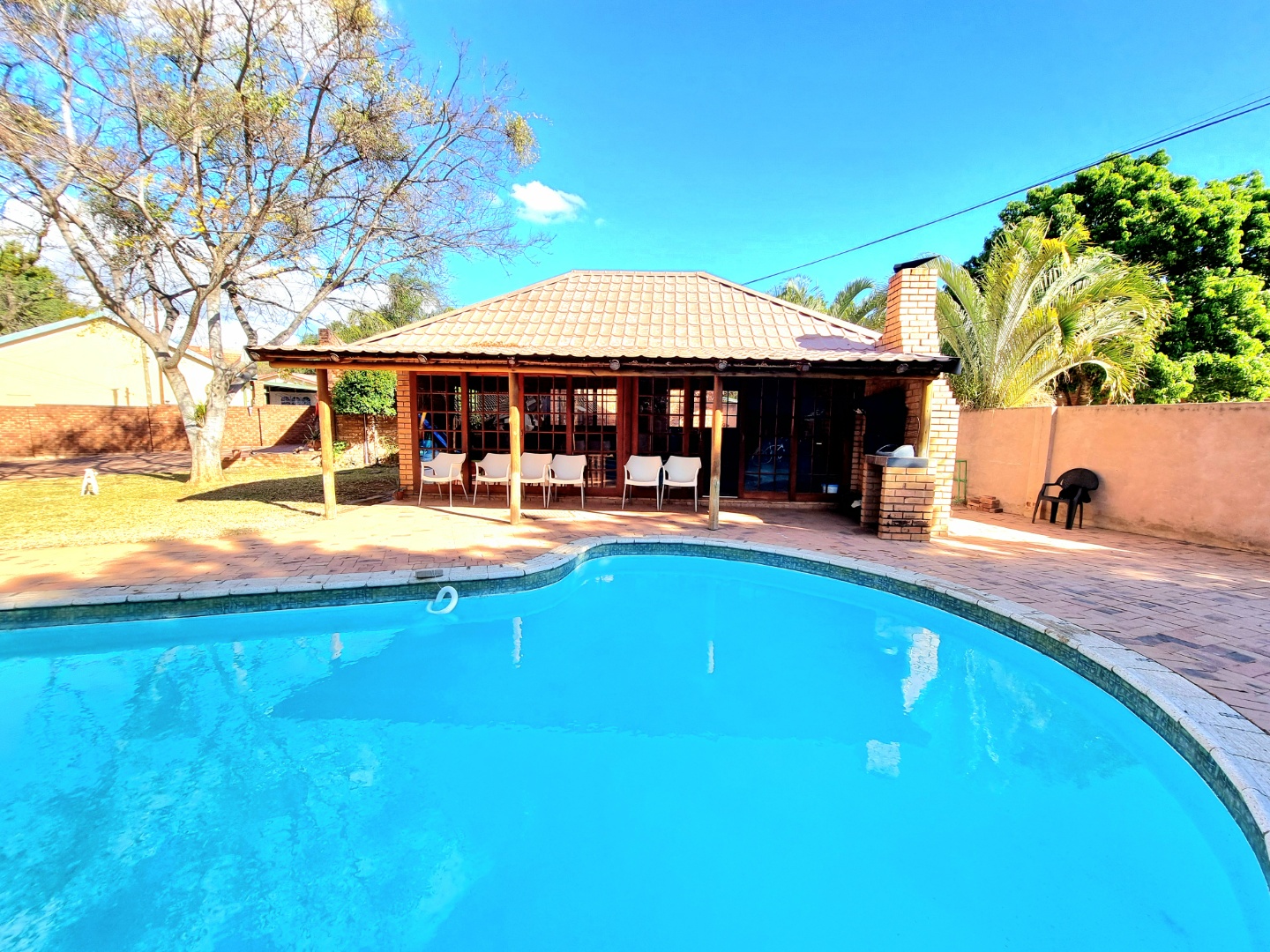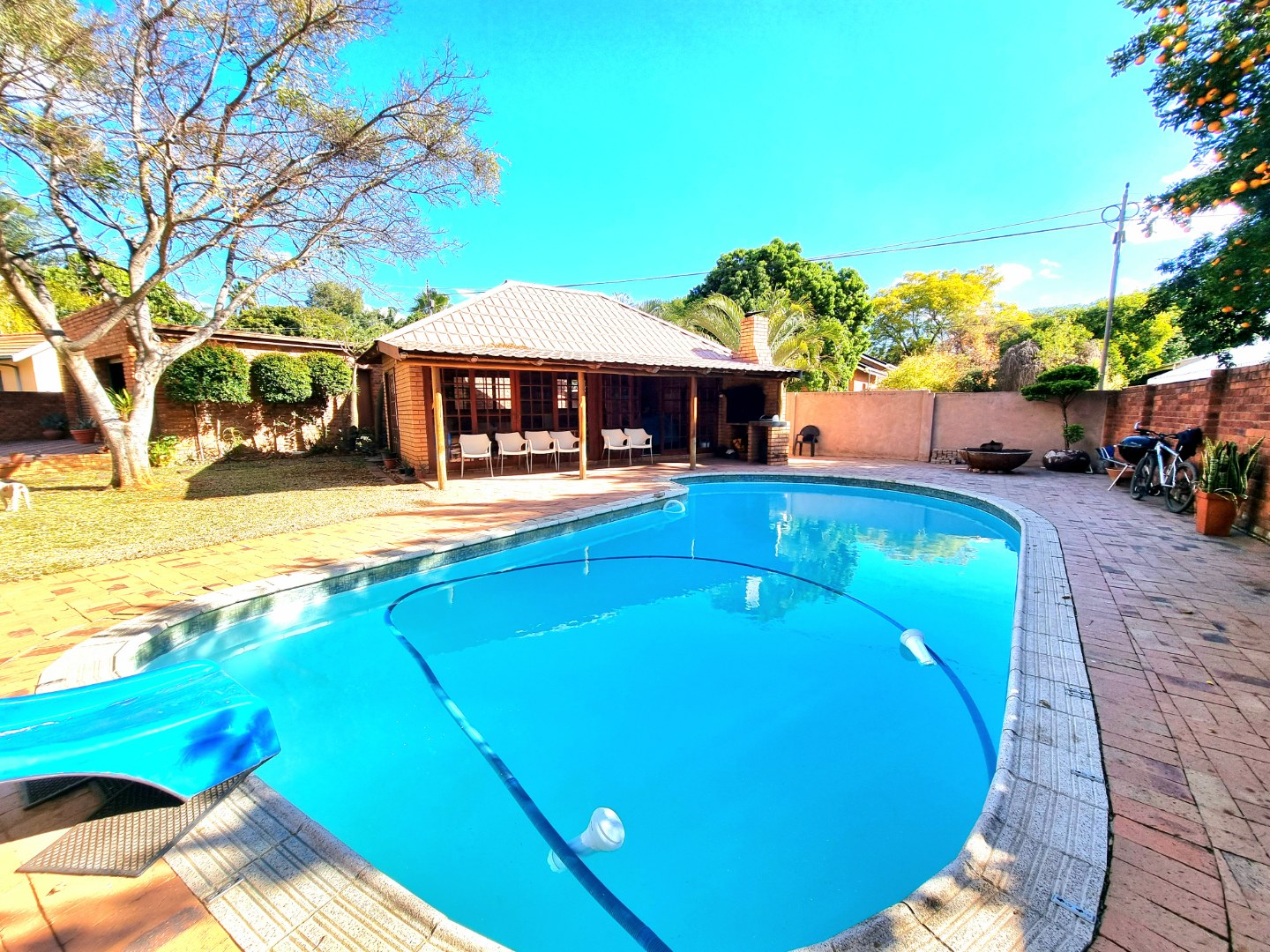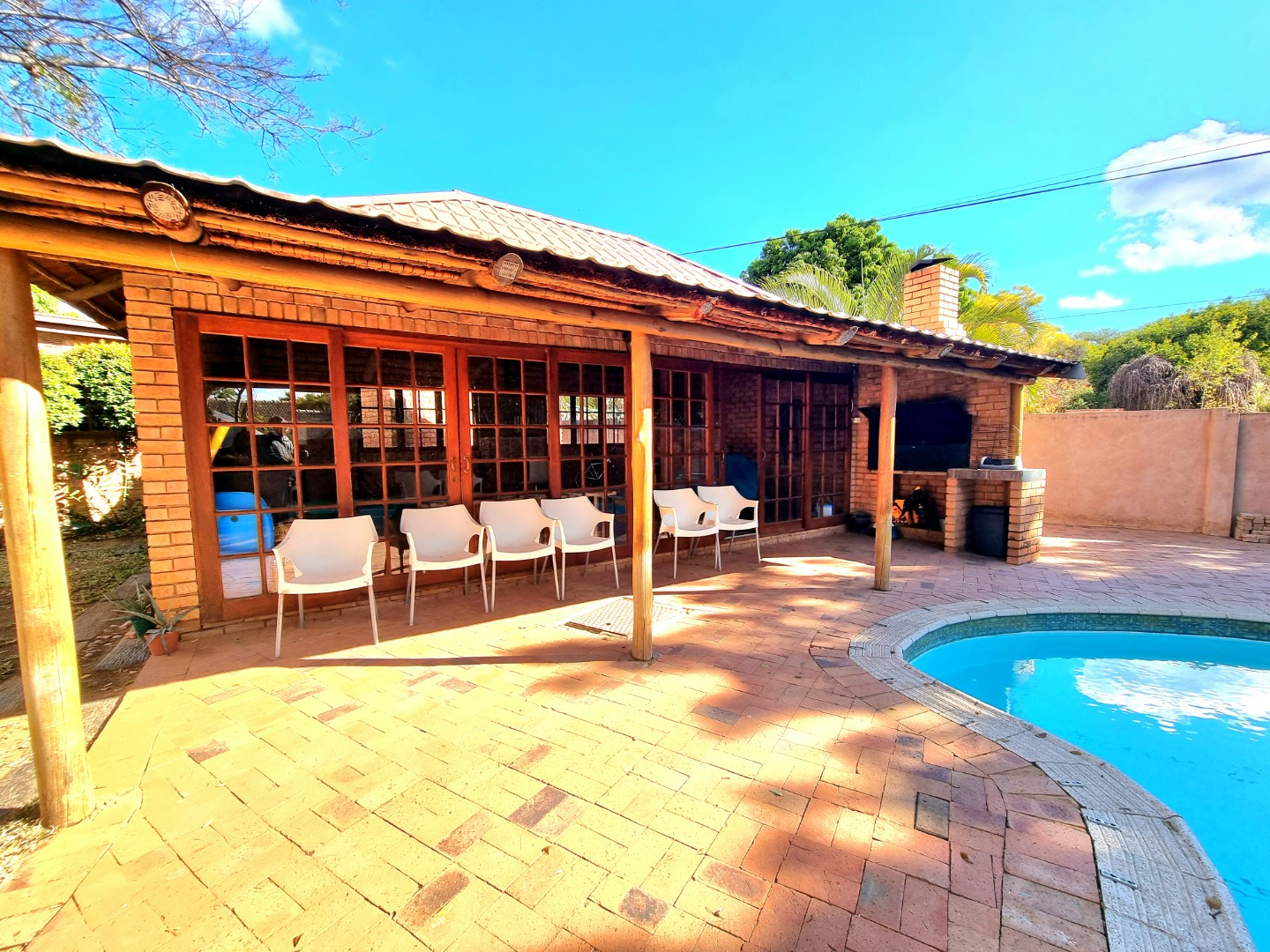 Outside, a paved driveway leads to a spacious double garage with ample storage space. At the rear of the garage are staff quarters. The property also features a swimming pool with a poolside entertainment area that includes a built-in braai. A backup water tank with a pressure pump ensures water availability, and the garden is fully irrigated.