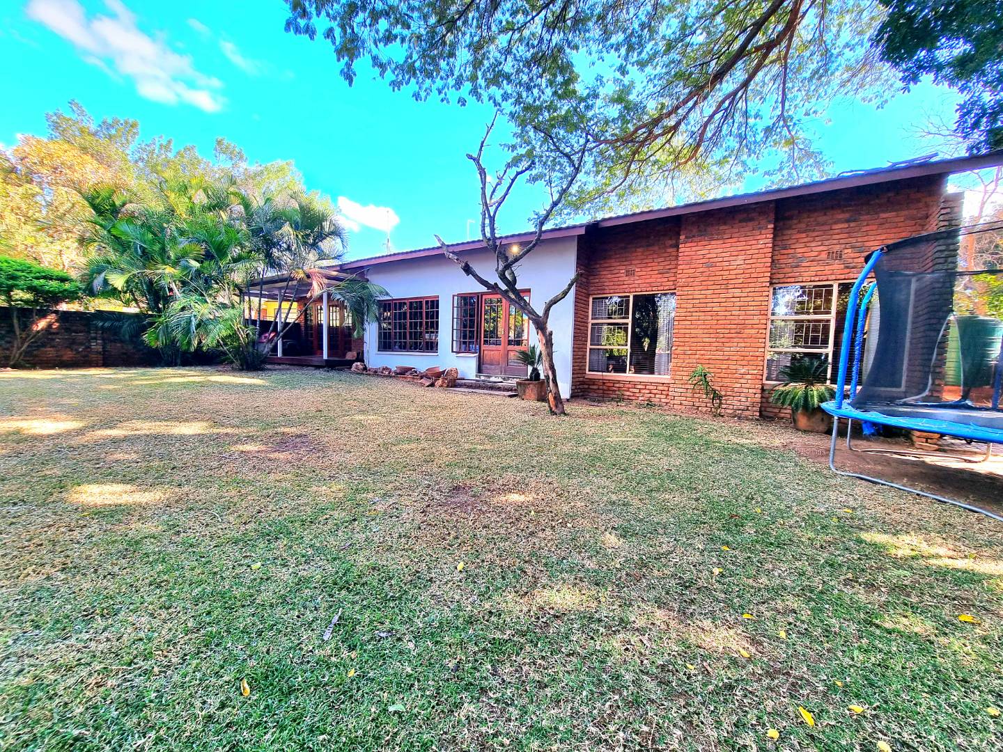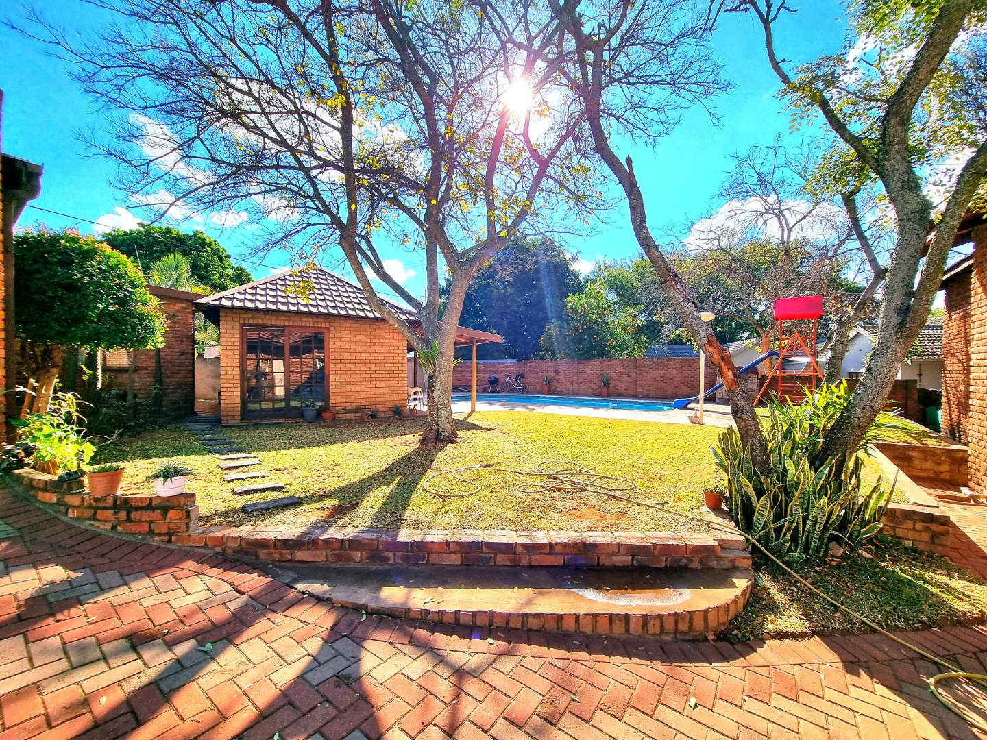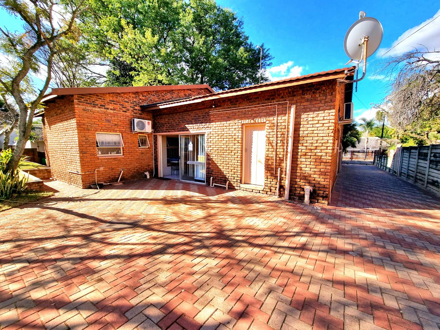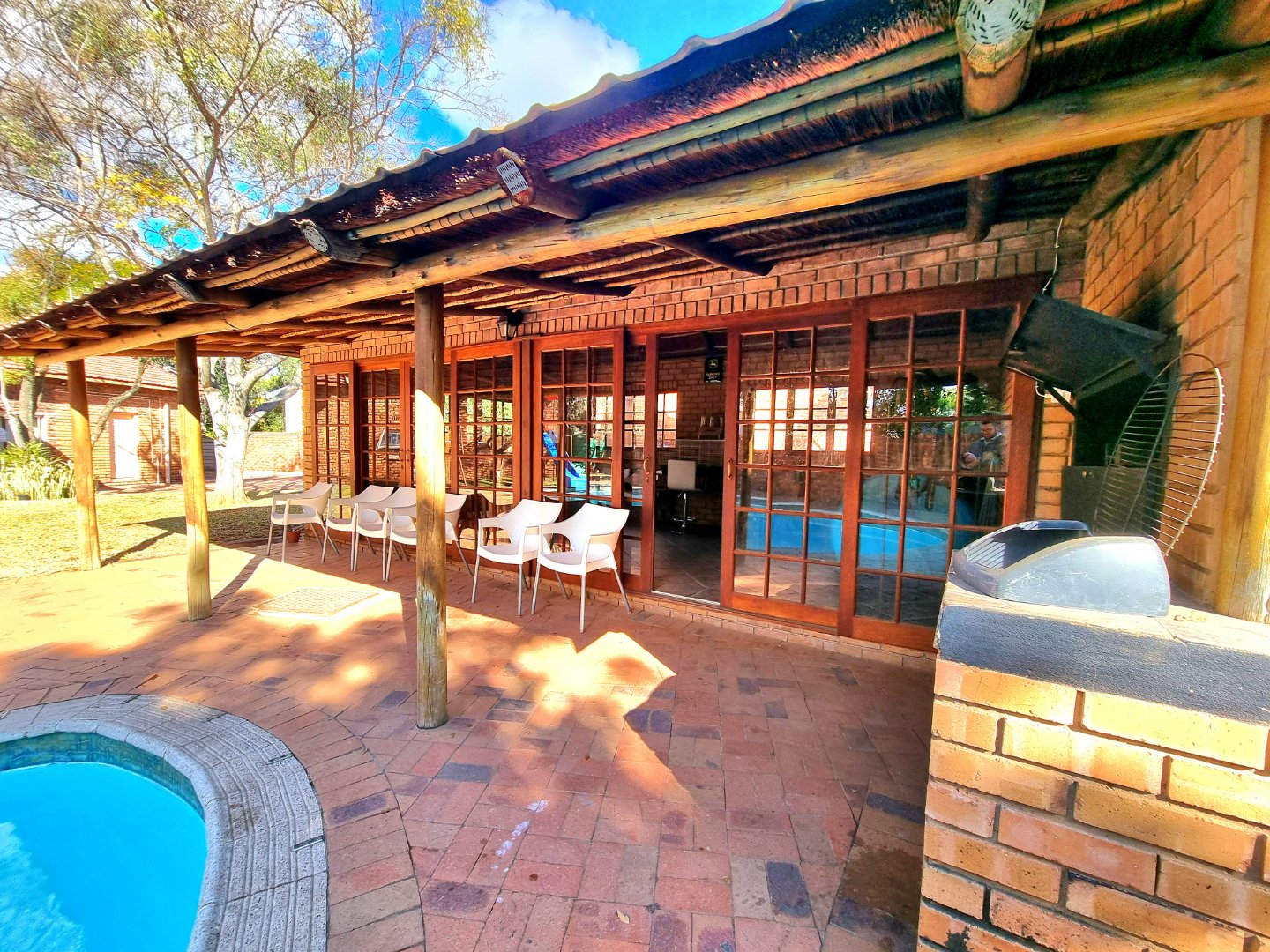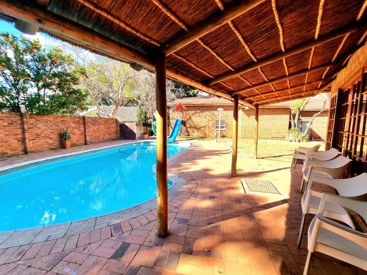 Outside, a paved driveway leads to a spacious double garage with ample storage space. At the rear of the garage are staff quarters. The property also features a swimming pool with a poolside entertainment area that includes a built-in braai. A backup water tank with a pressure pump ensures water availability, and the garden is fully irrigated.