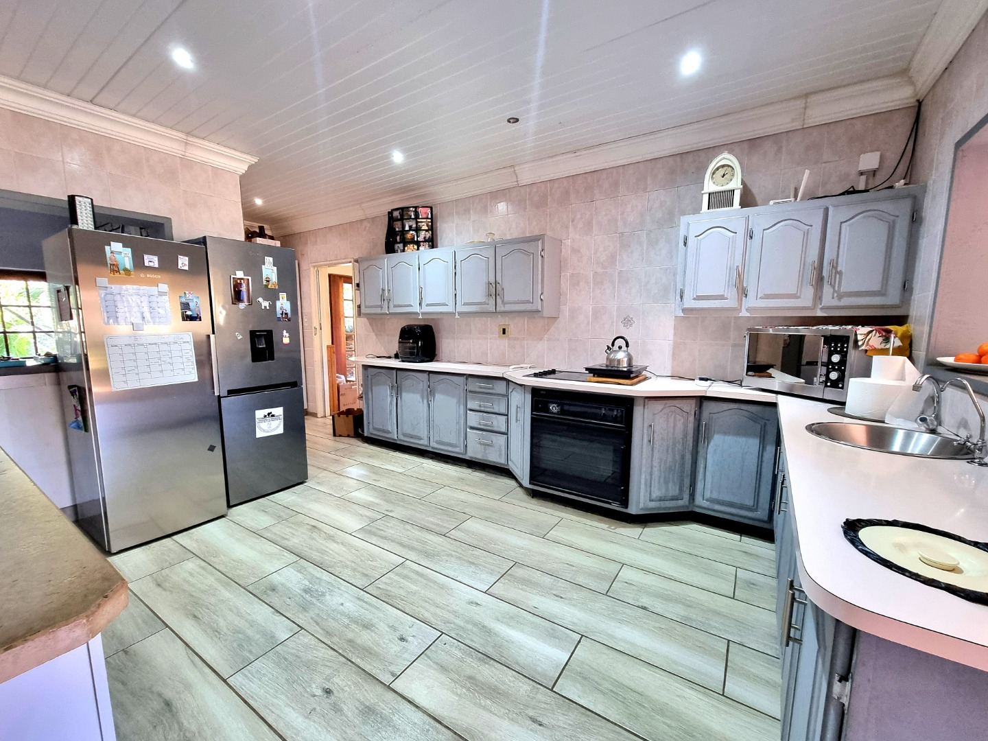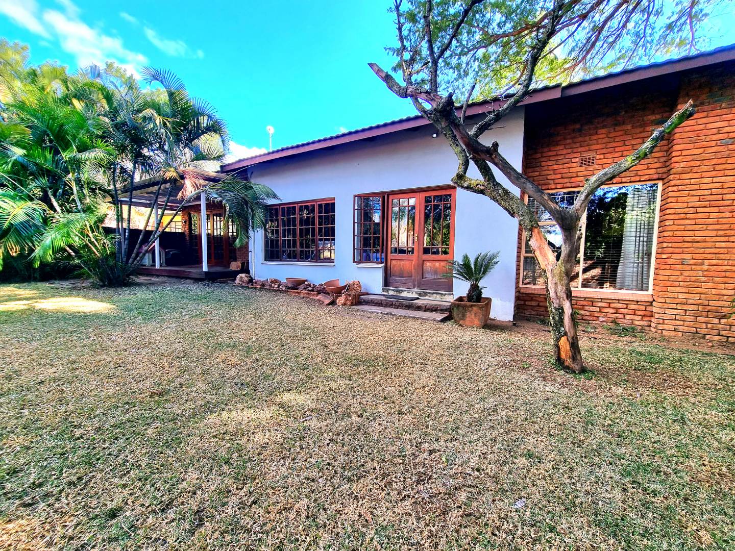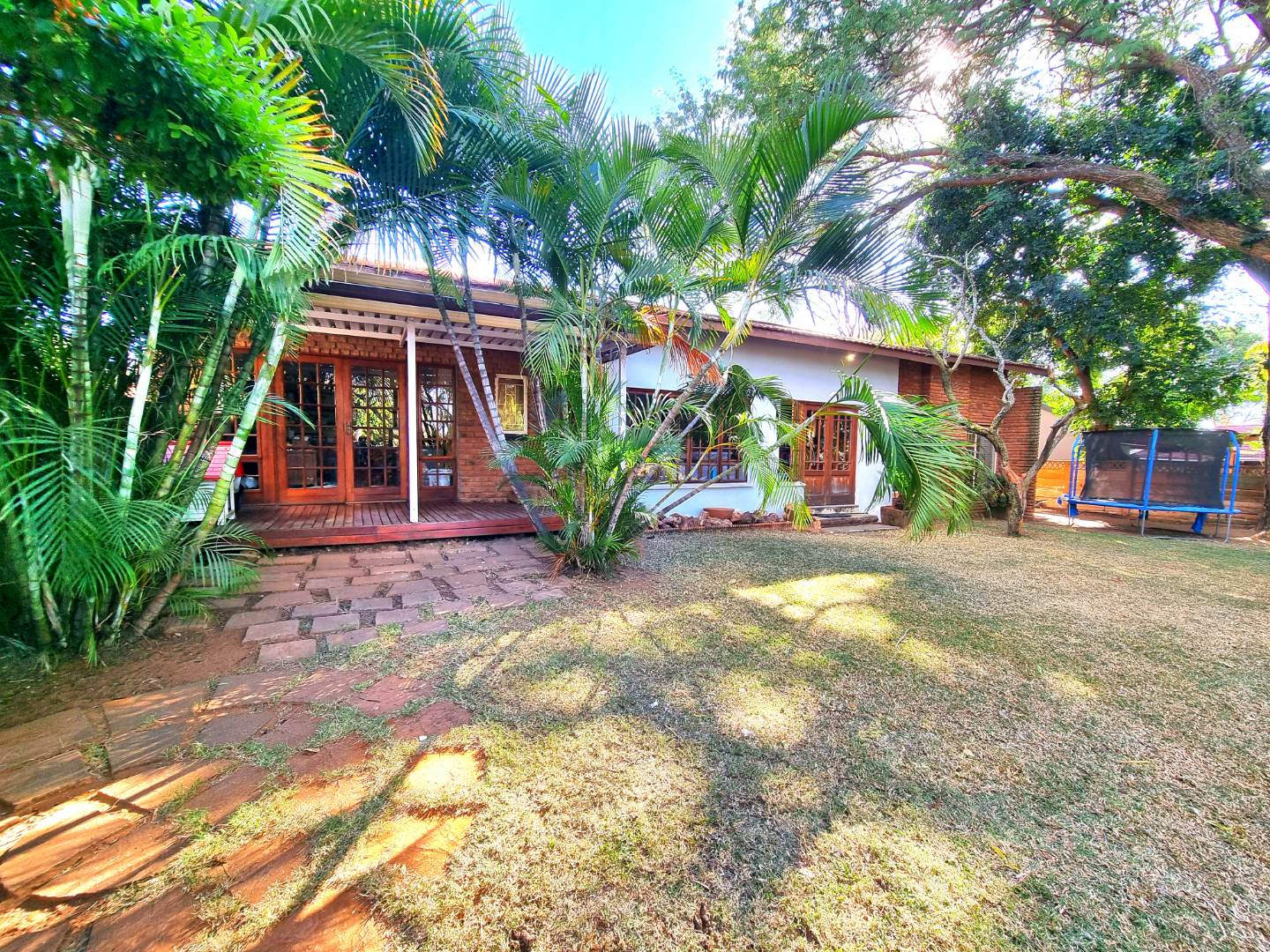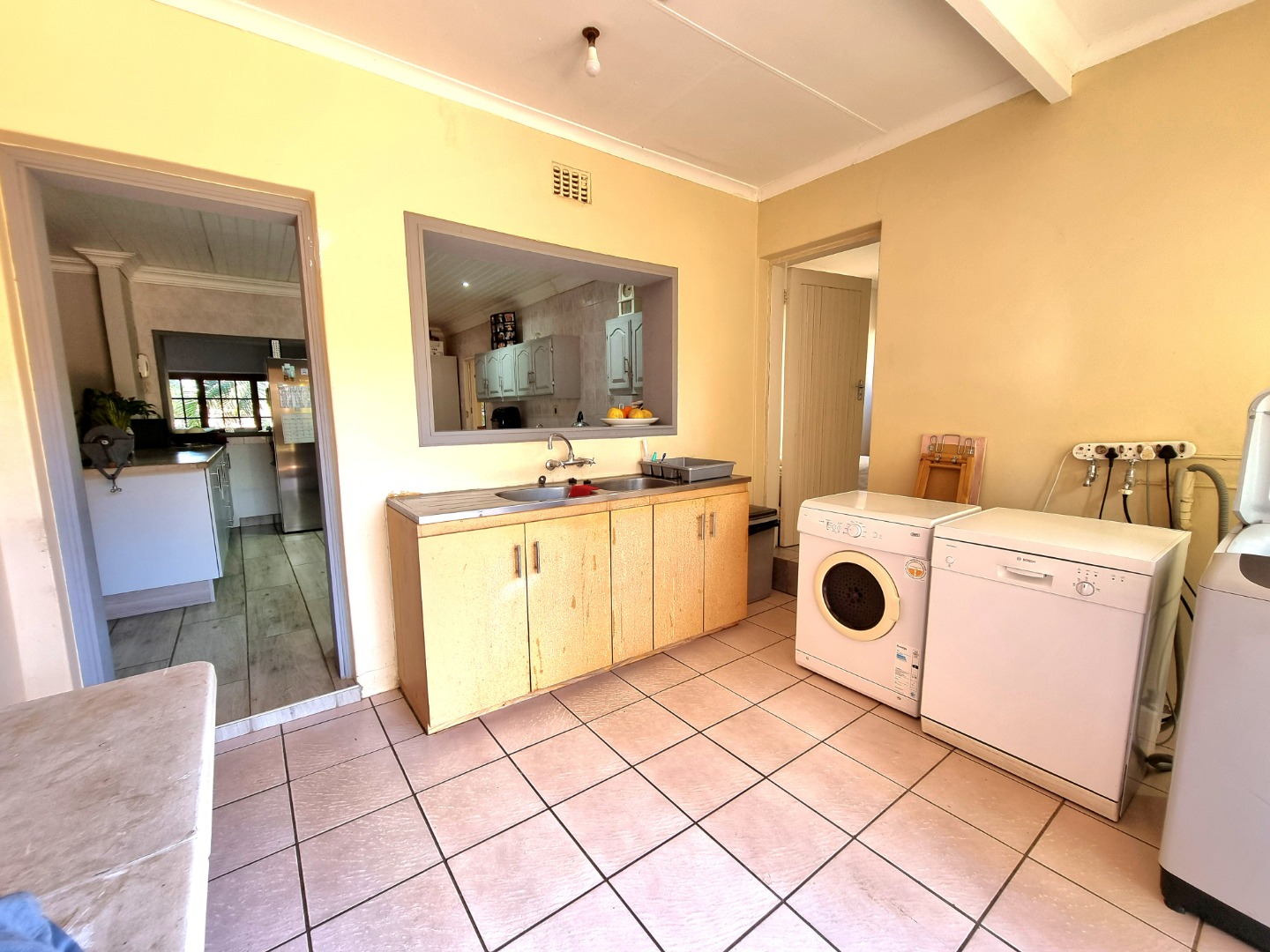 Outside, a paved driveway leads to a spacious double garage with ample storage space. At the rear of the garage are staff quarters. The property also features a swimming pool with a poolside entertainment area that includes a built-in braai. A backup water tank with a pressure pump ensures water availability, and the garden is fully irrigated.