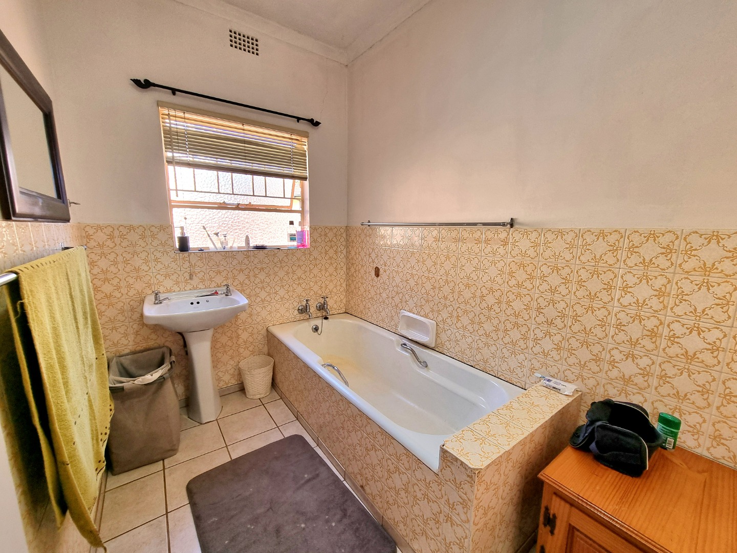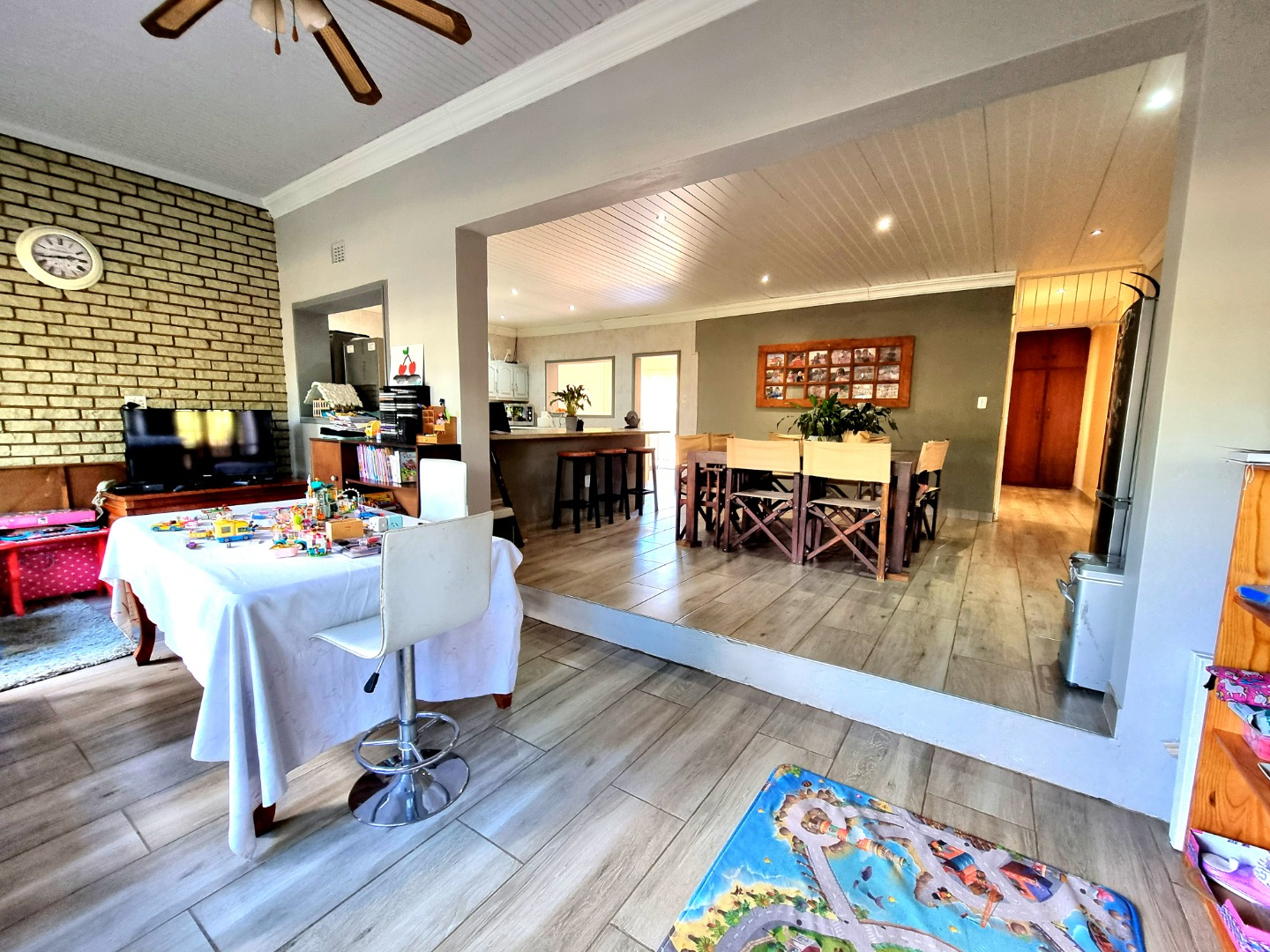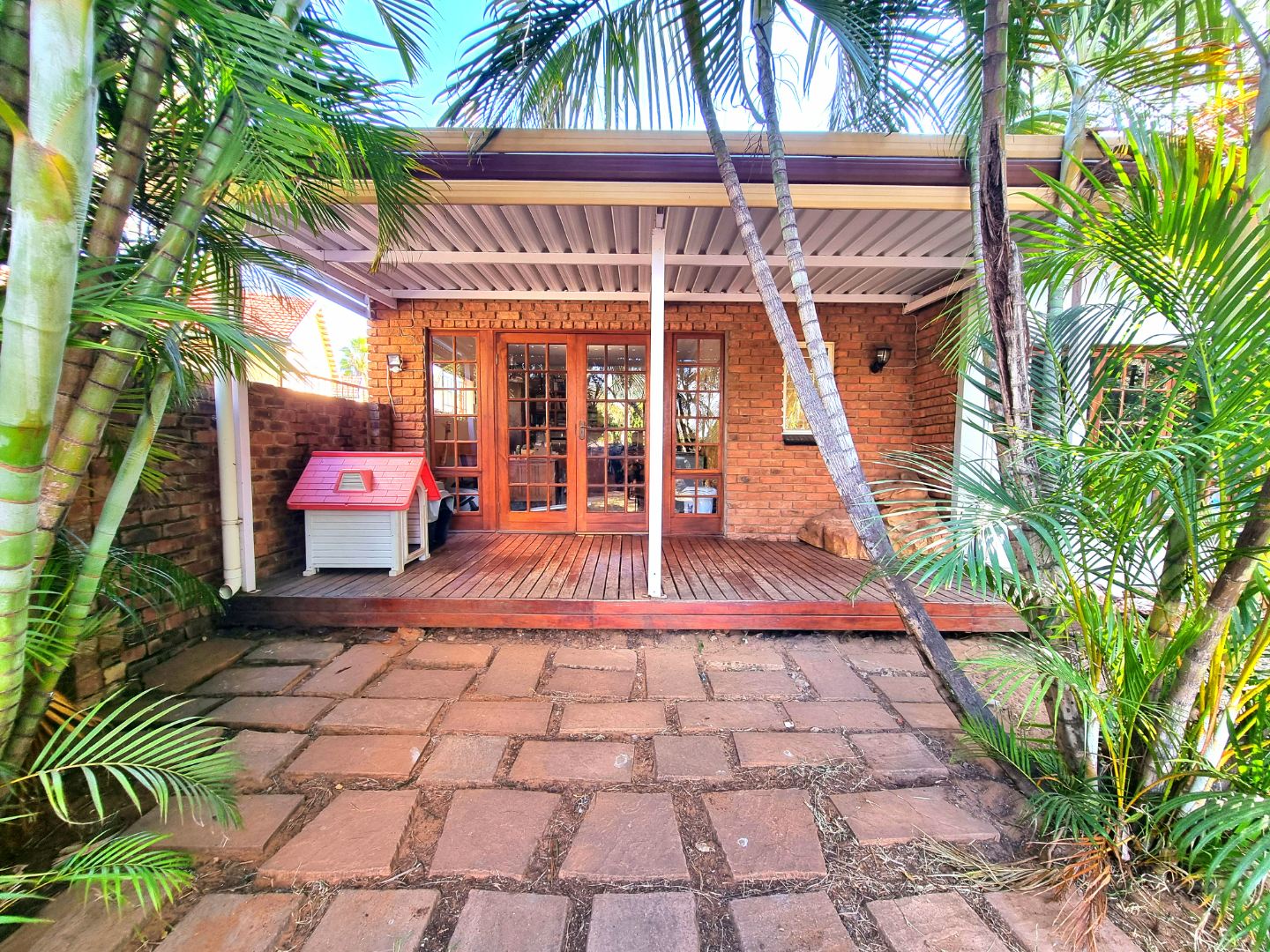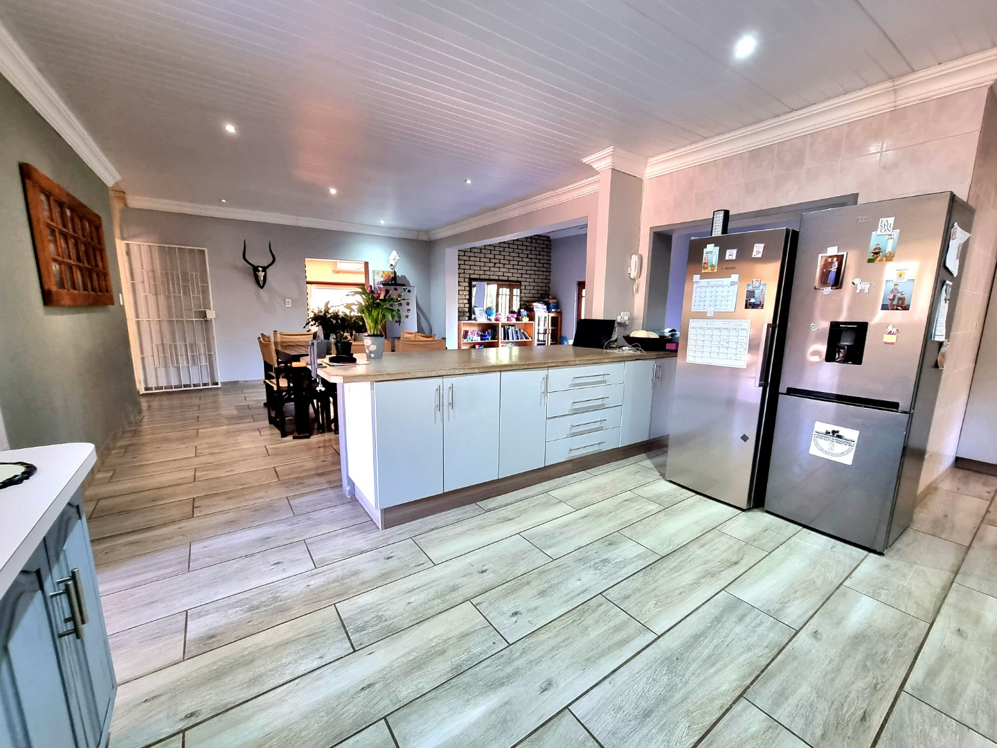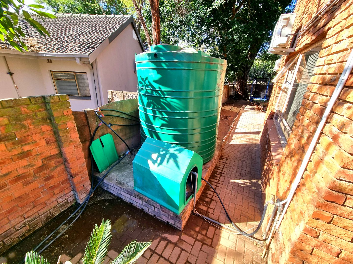 Outside, a paved driveway leads to a spacious double garage with ample storage space. At the rear of the garage are staff quarters. The property also features a swimming pool with a poolside entertainment area that includes a built-in braai. A backup water tank with a pressure pump ensures water availability, and the garden is fully irrigated.