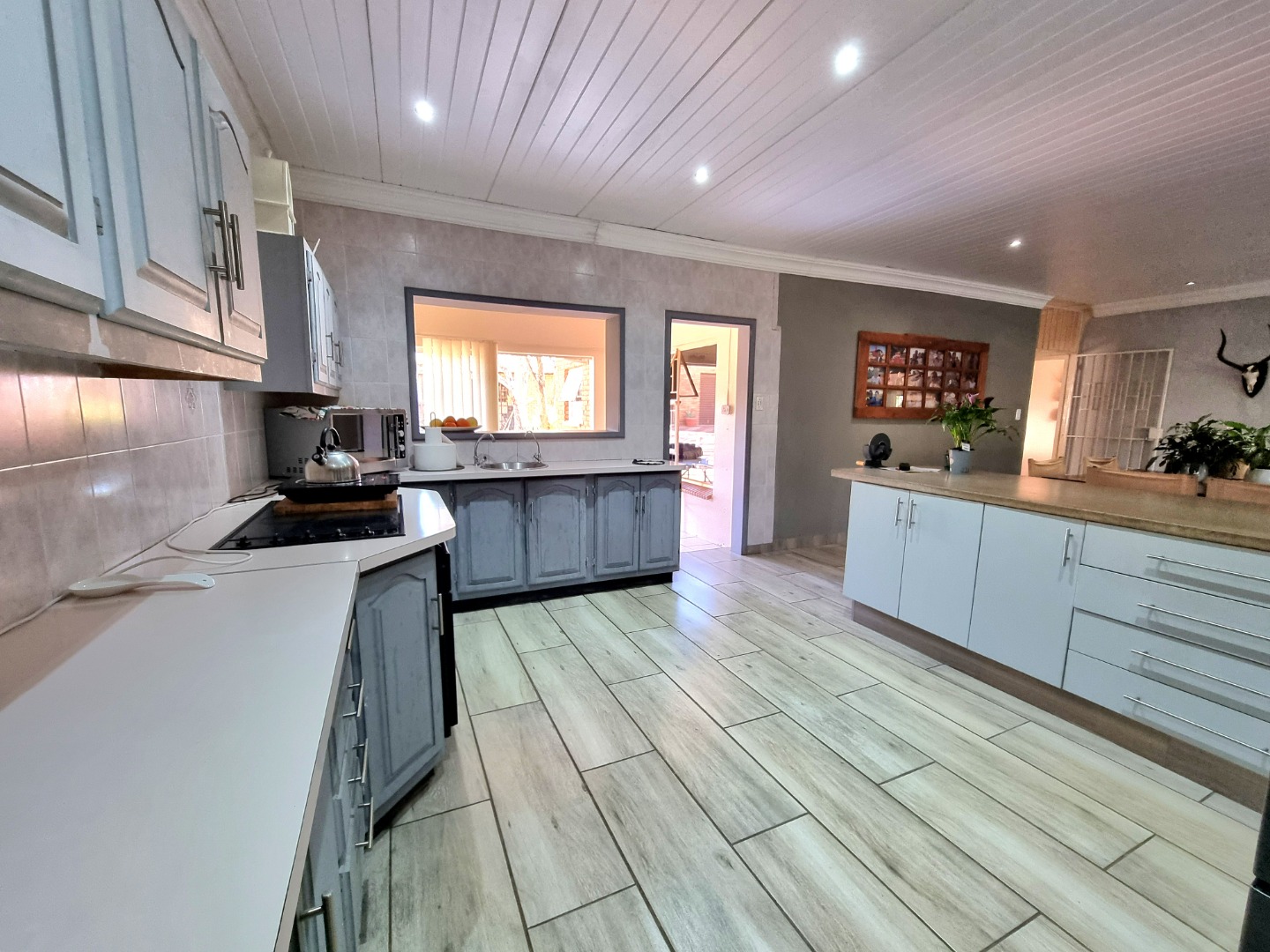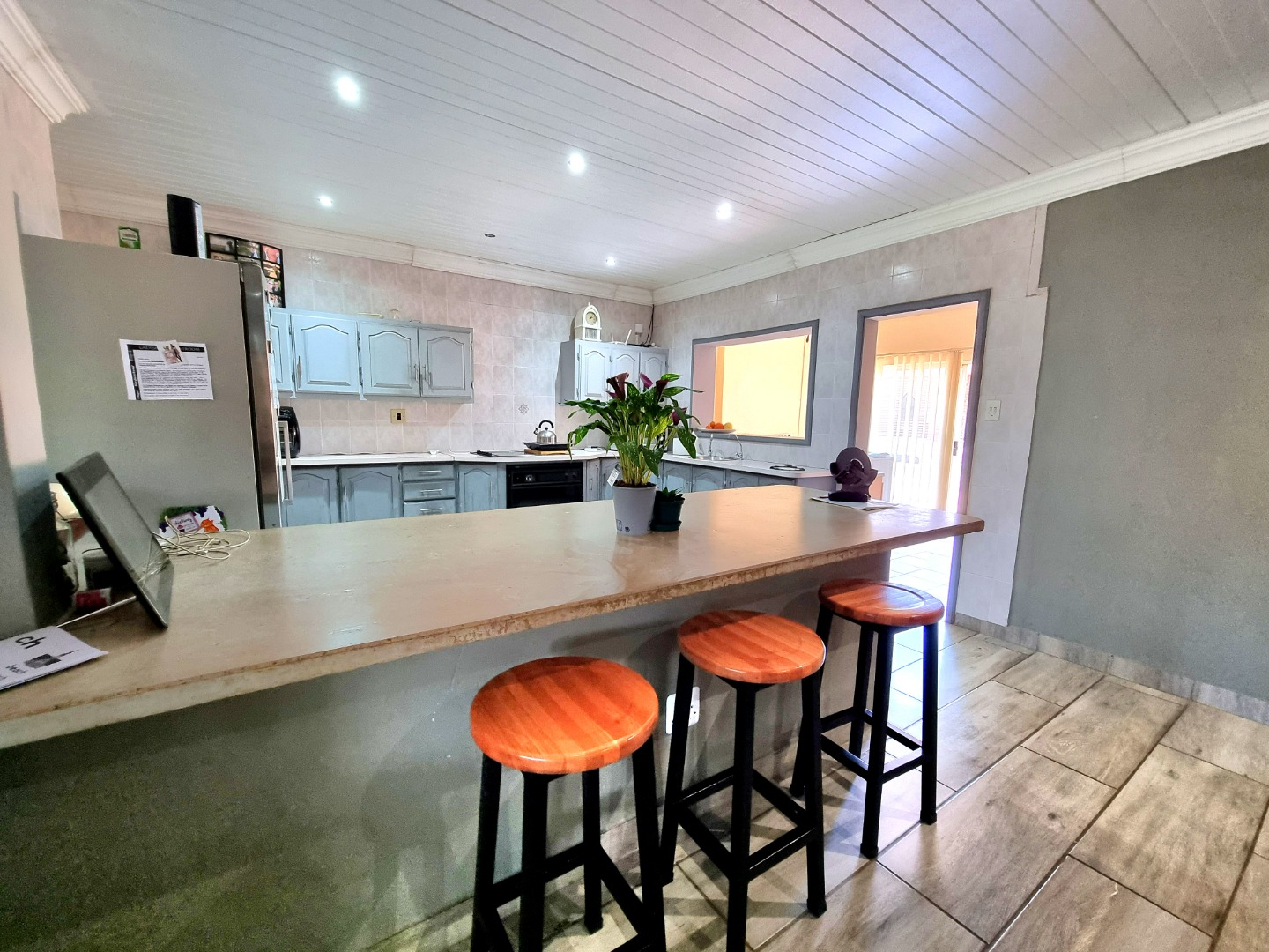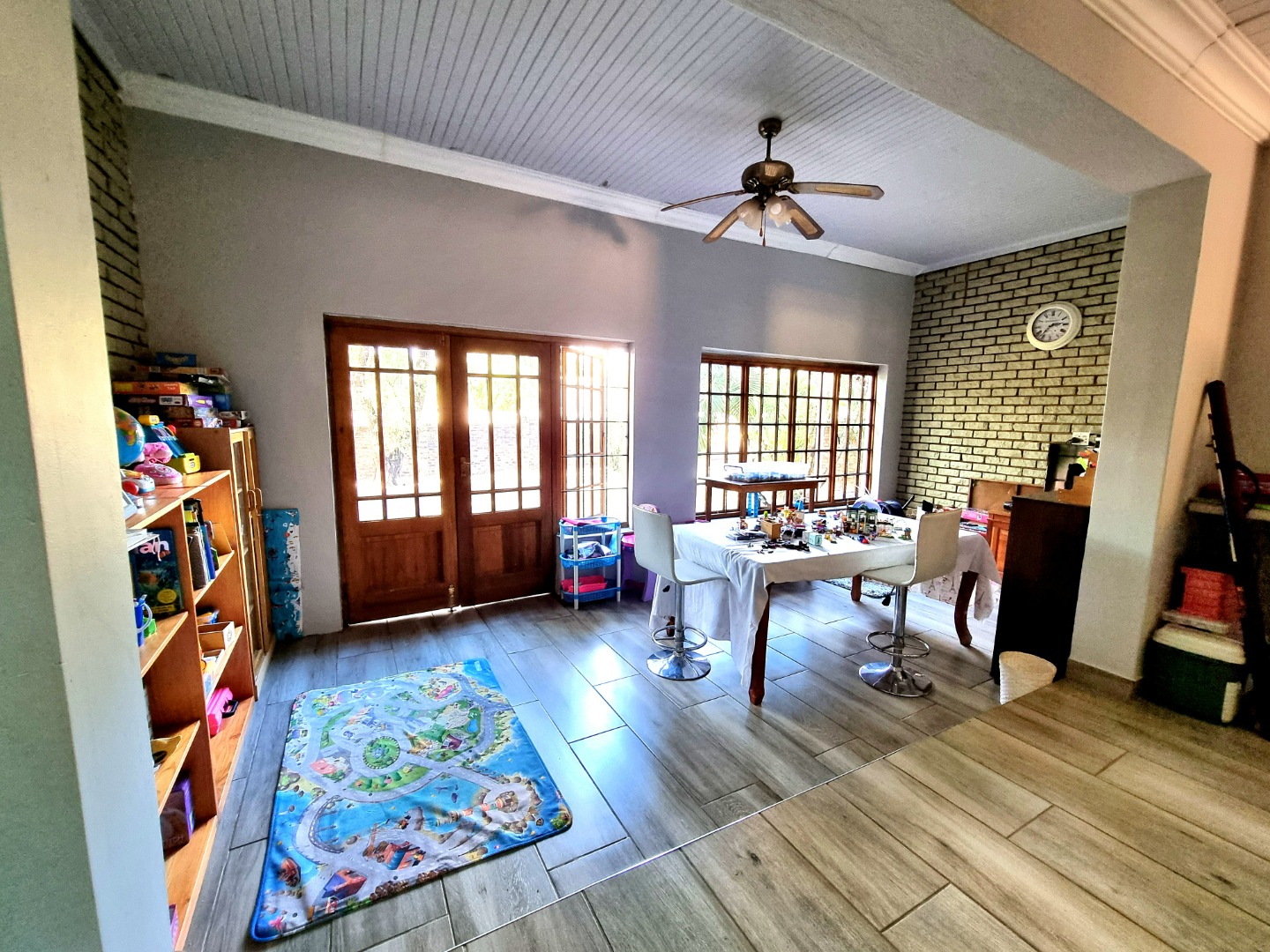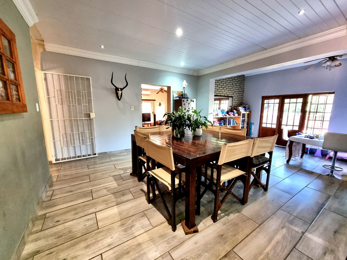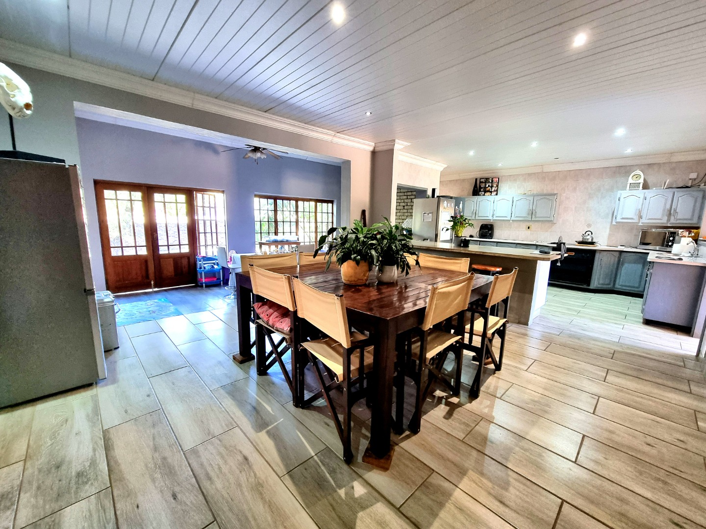 The house begins with a well-appointed kitchen featuring built-in cupboards, an electric stove, and an electric hob. This kitchen seamlessly integrates with an open-plan dining area and living area, where a ceiling fan enhances comfort. From the kitchen, one can enter a study room that opens onto a covered patio. Adjacent to the kitchen, there is a separate scullery and laundry room. The laundry room leads to a tiled bedroom equipped with air conditioning and an Ensuite bathroom containing a toilet, shower, and sink. This bedroom doubles as a guest bedroom and bathroom.