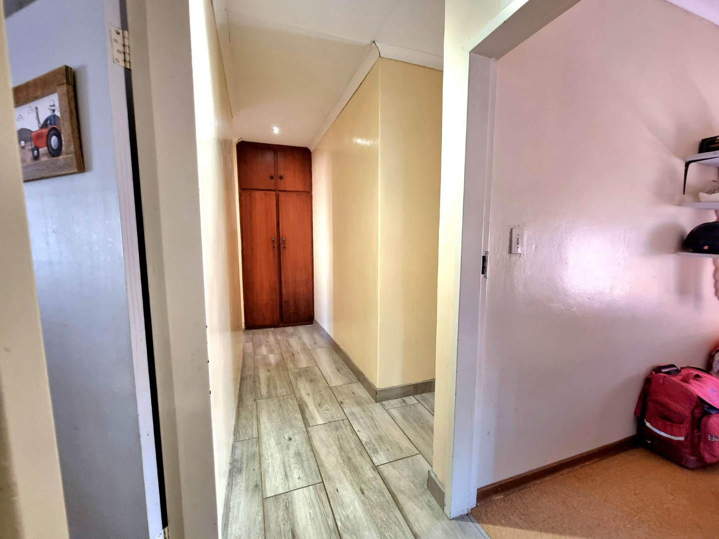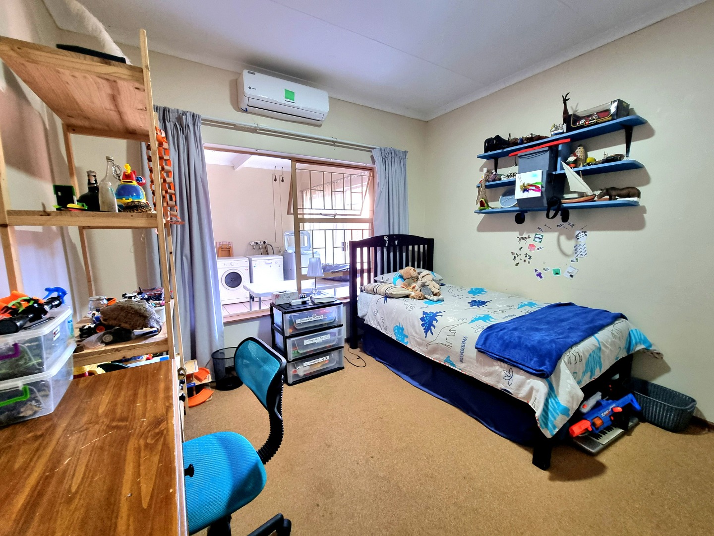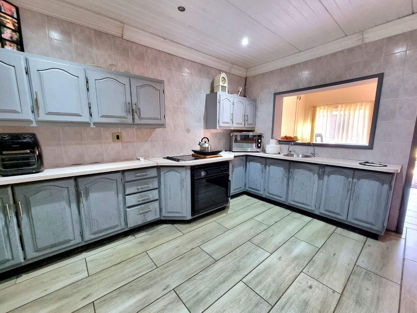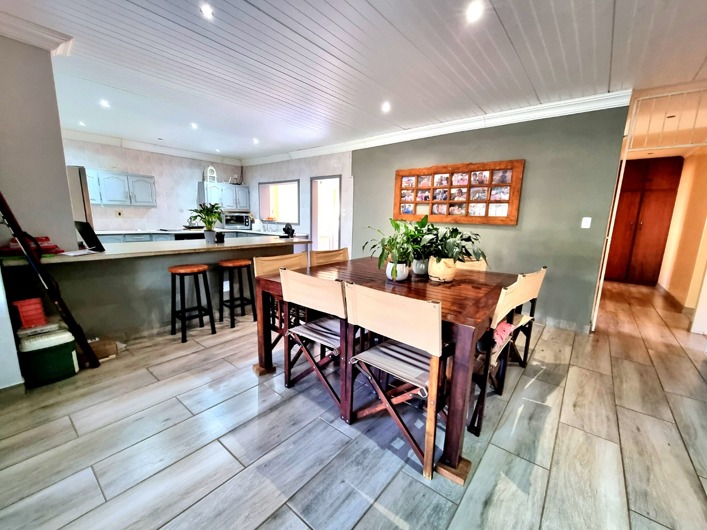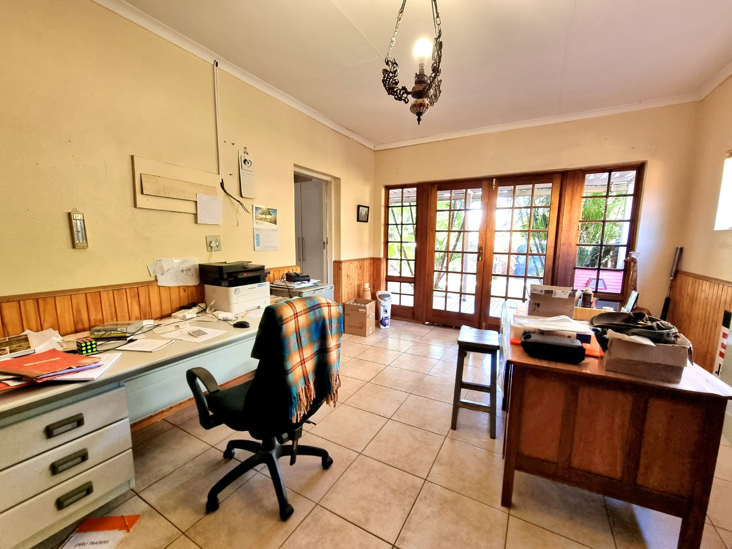 The house begins with a well-appointed kitchen featuring built-in cupboards, an electric stove, and an electric hob. This kitchen seamlessly integrates with an open-plan dining area and living area, where a ceiling fan enhances comfort. From the kitchen, one can enter a study room that opens onto a covered patio. Adjacent to the kitchen, there is a separate scullery and laundry room. The laundry room leads to a tiled bedroom equipped with air conditioning and an Ensuite bathroom containing a toilet, shower, and sink. This bedroom doubles as a guest bedroom and bathroom.