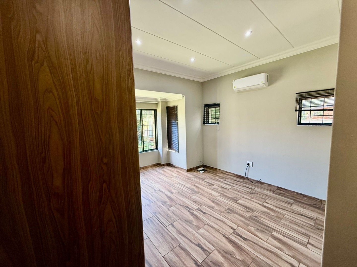 The home offers four spacious bedrooms, all fitted with built-in cupboards. One spare bedroom is equipped with air conditioning. The main bedroom features a full en-suite bathroom comprising a bath, shower, toilet, and basin, and opens directly onto the covered porch, creating a seamless indoor-outdoor flow.