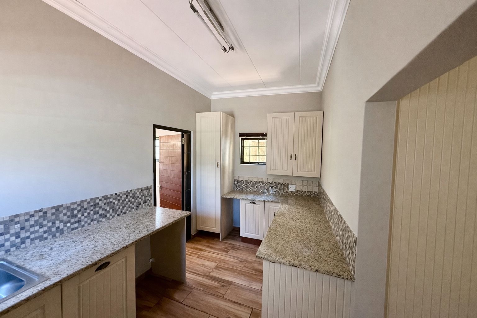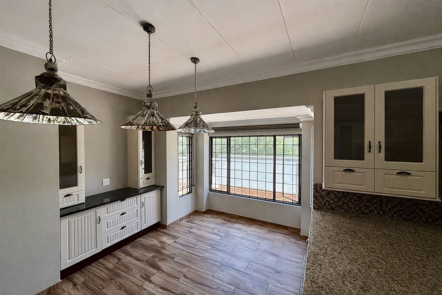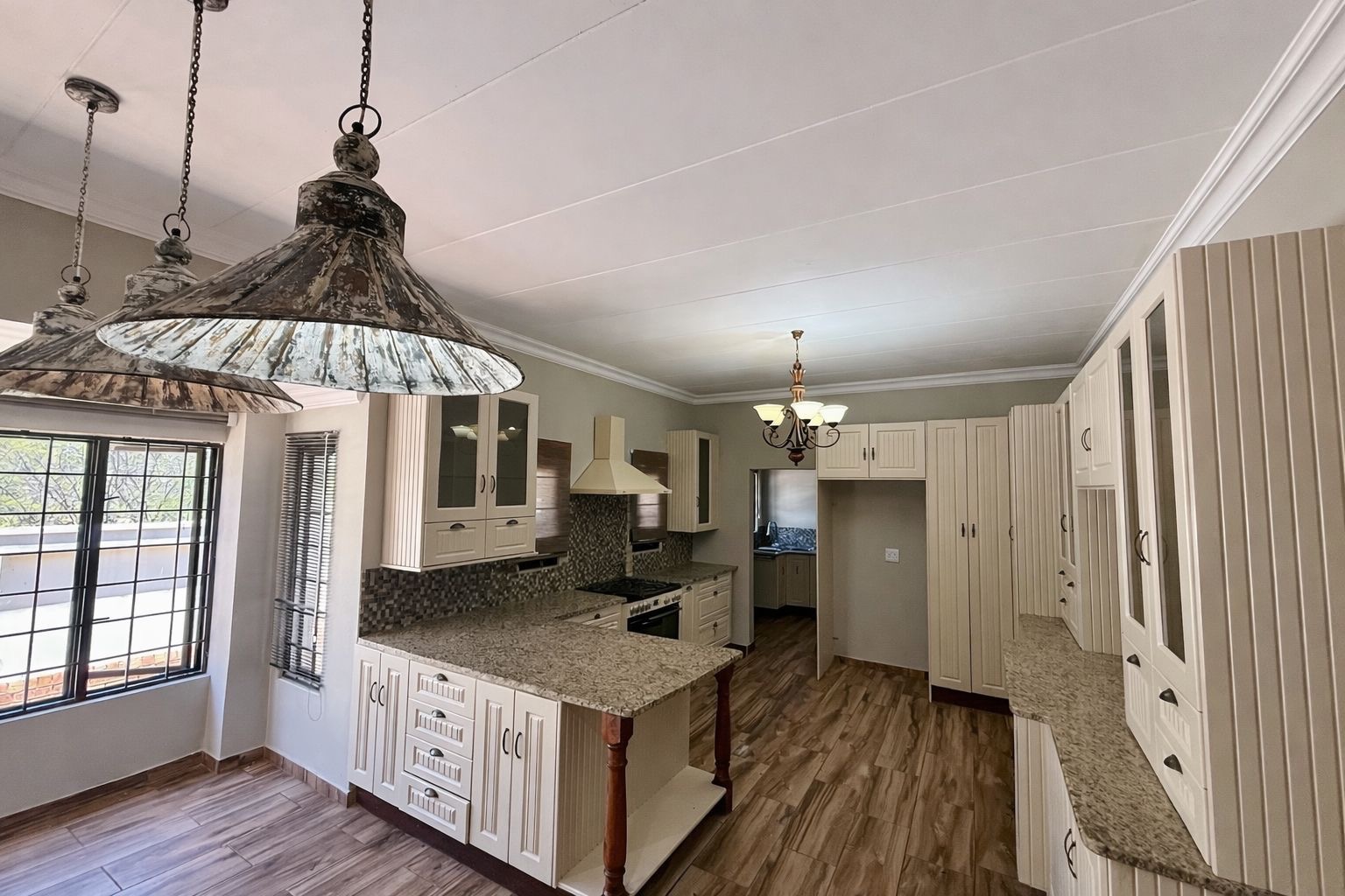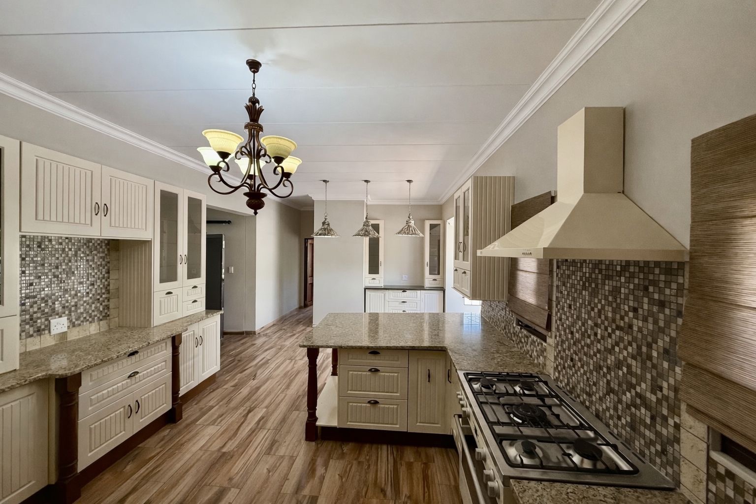 The kitchen is well-designed and practical, fitted with granite countertops, ample cupboard space, and a gas stove, making it ideal for both everyday living and entertaining.