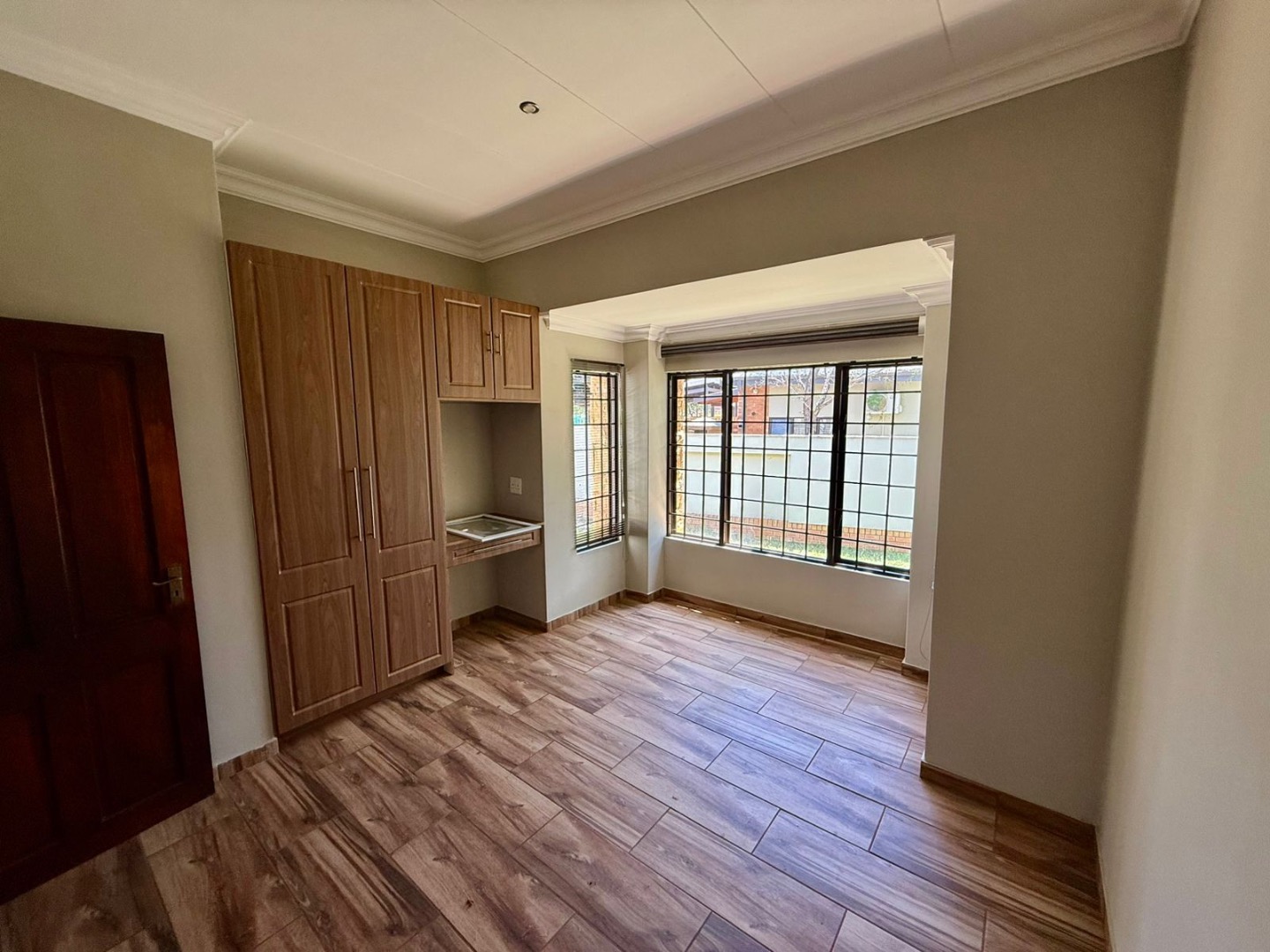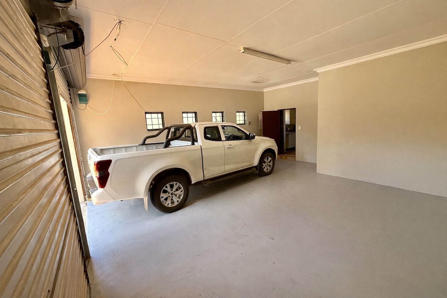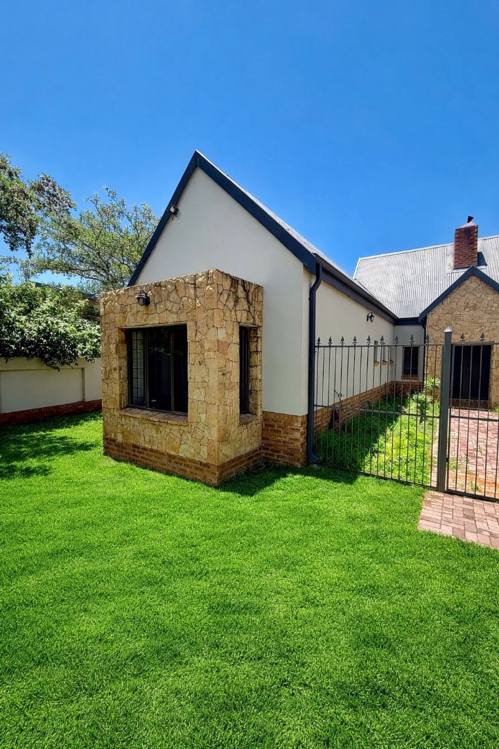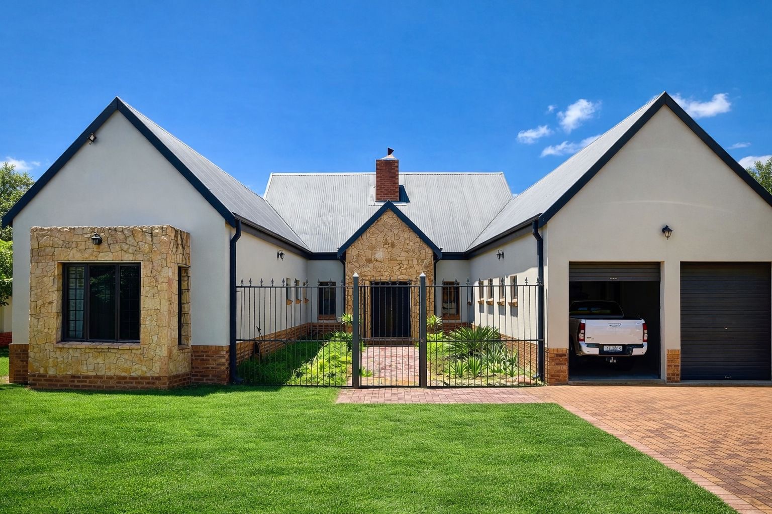 The property includes a double garage with two garage doors, direct access into the house via a door from the garage, and a storeroom located within the garage. Security features include burglar bars and security doors, providing peace of mind.