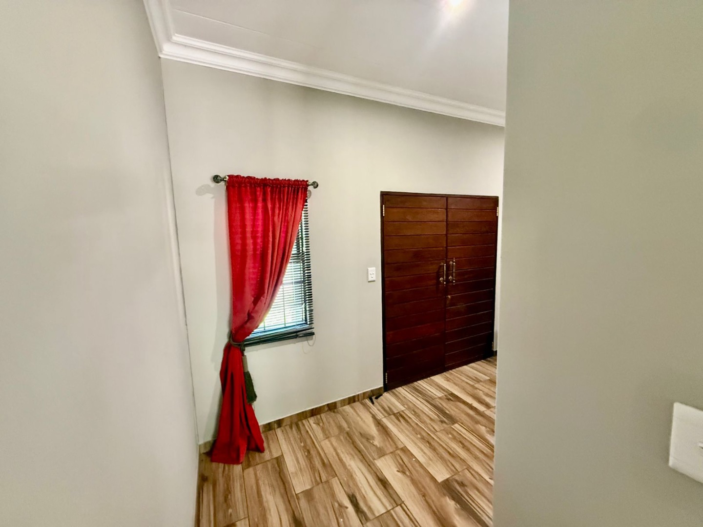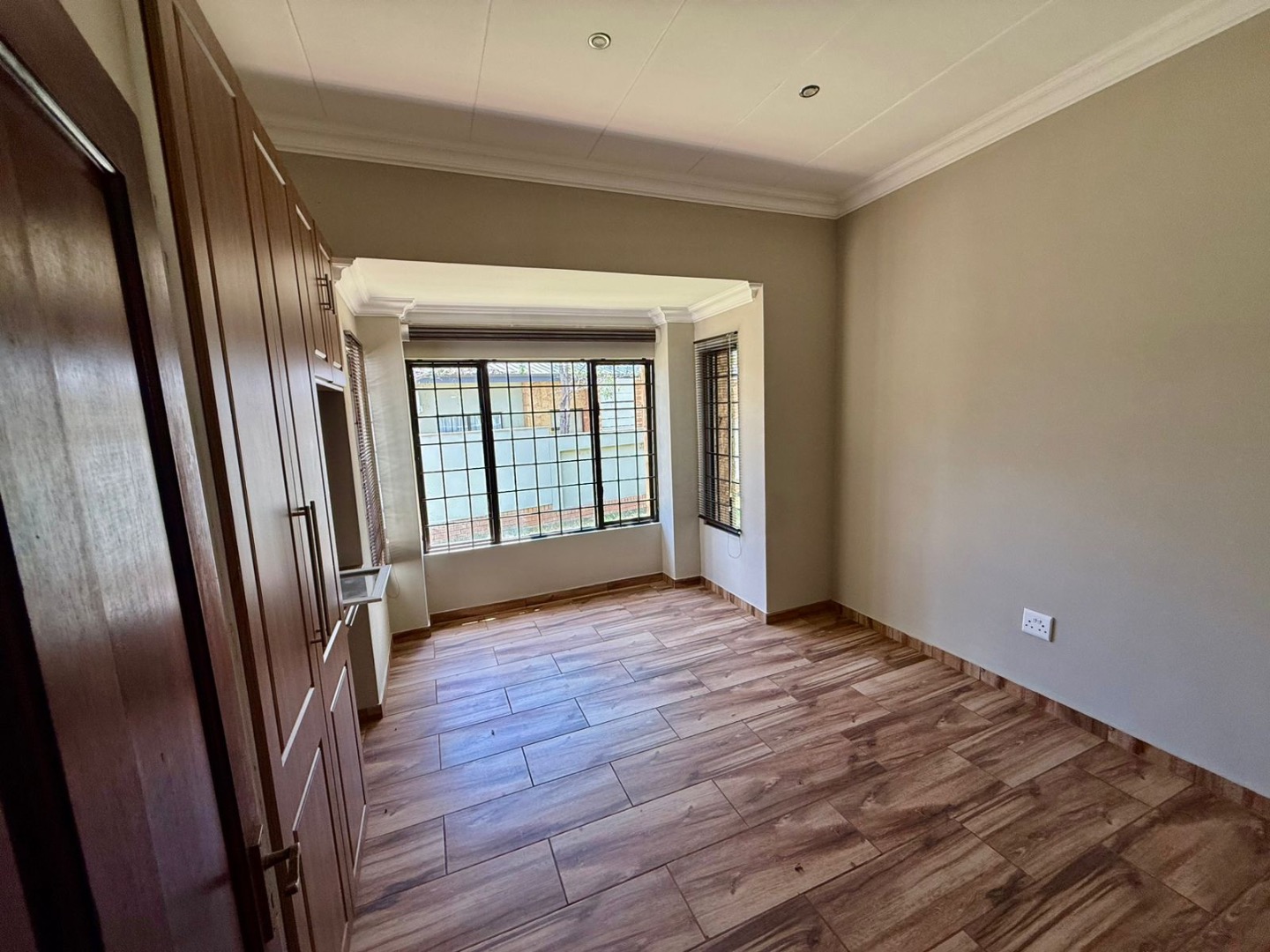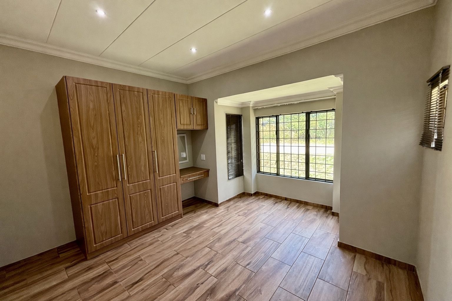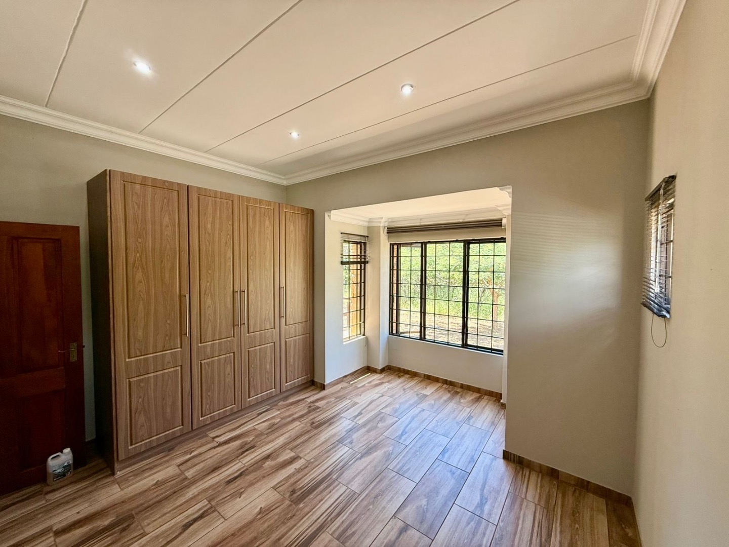 The property includes a double garage with two garage doors, direct access into the house via a door from the garage, and a storeroom located within the garage. Security features include burglar bars and security doors, providing peace of mind.