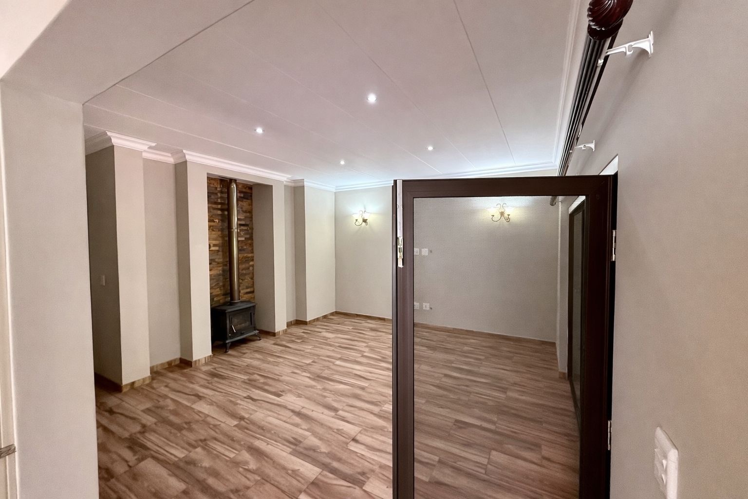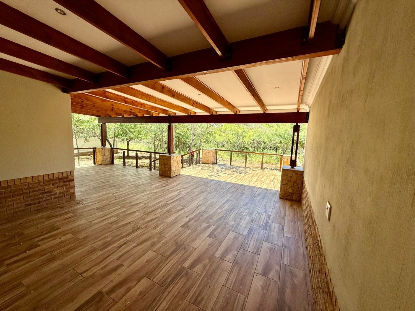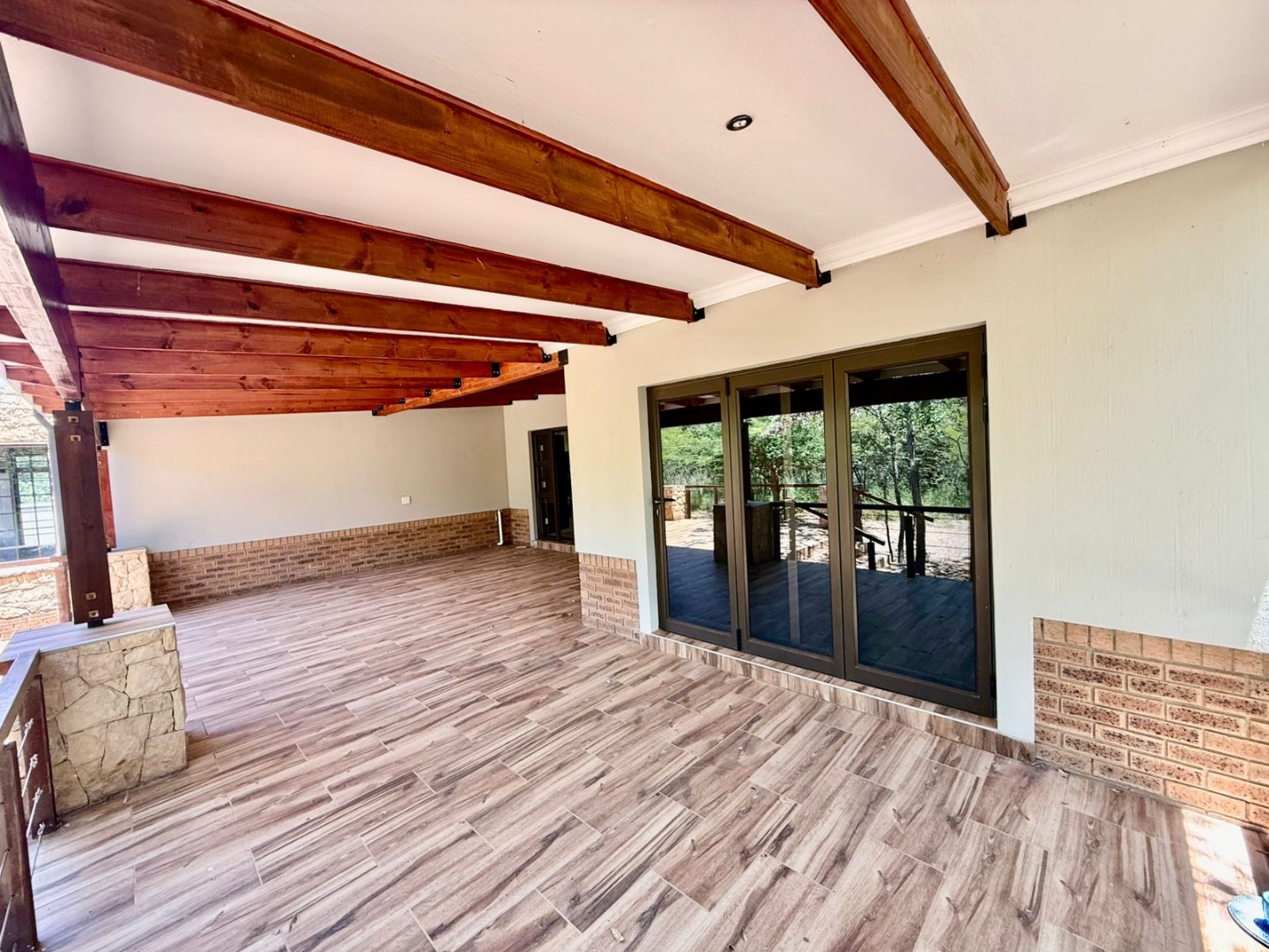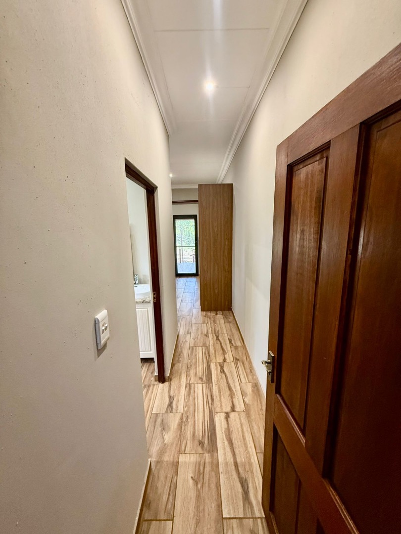 The living spaces consist of a living room, dining room, and kitchen, all flowing together in an open-plan layout that enhances space and natural light. The living room features a fireplace, creating a warm and inviting atmosphere, ideal for the cooler bushveld evenings.