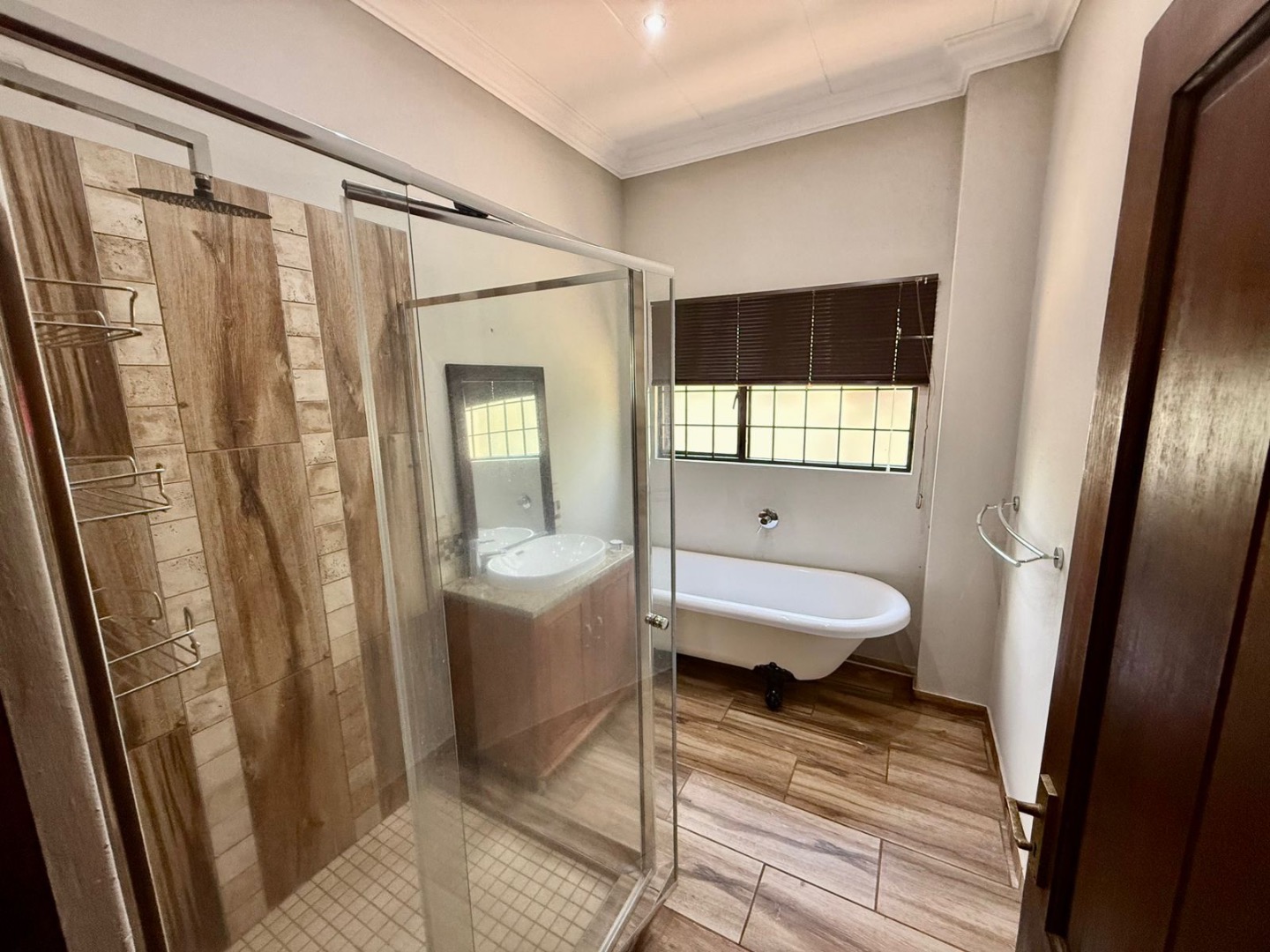 There are 2.5 bathrooms in total, including a second bathroom located in the passage with a shower, toilet, and basin, as well as a separate guest toilet with a basin.