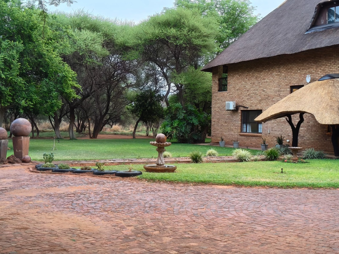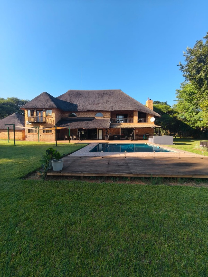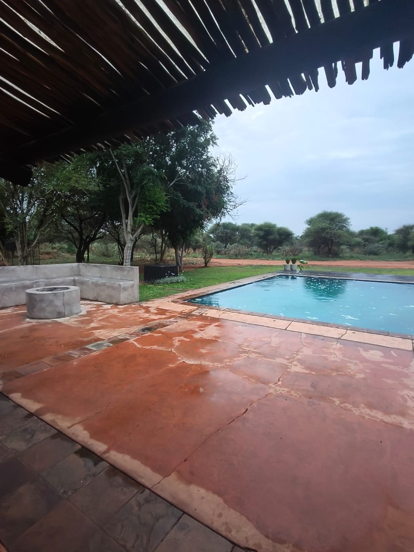 Outdoor features include a large swimming pool, fire pit with seating, manicured garden with irrigation, double garage with thatch roof, outside storeroom with bathroom, a 5,000L JoJo tank with pump, zinc dam, livestock drinking trough, and a borehole delivering approximately 22,000 litres per hour with a 4kW pump.