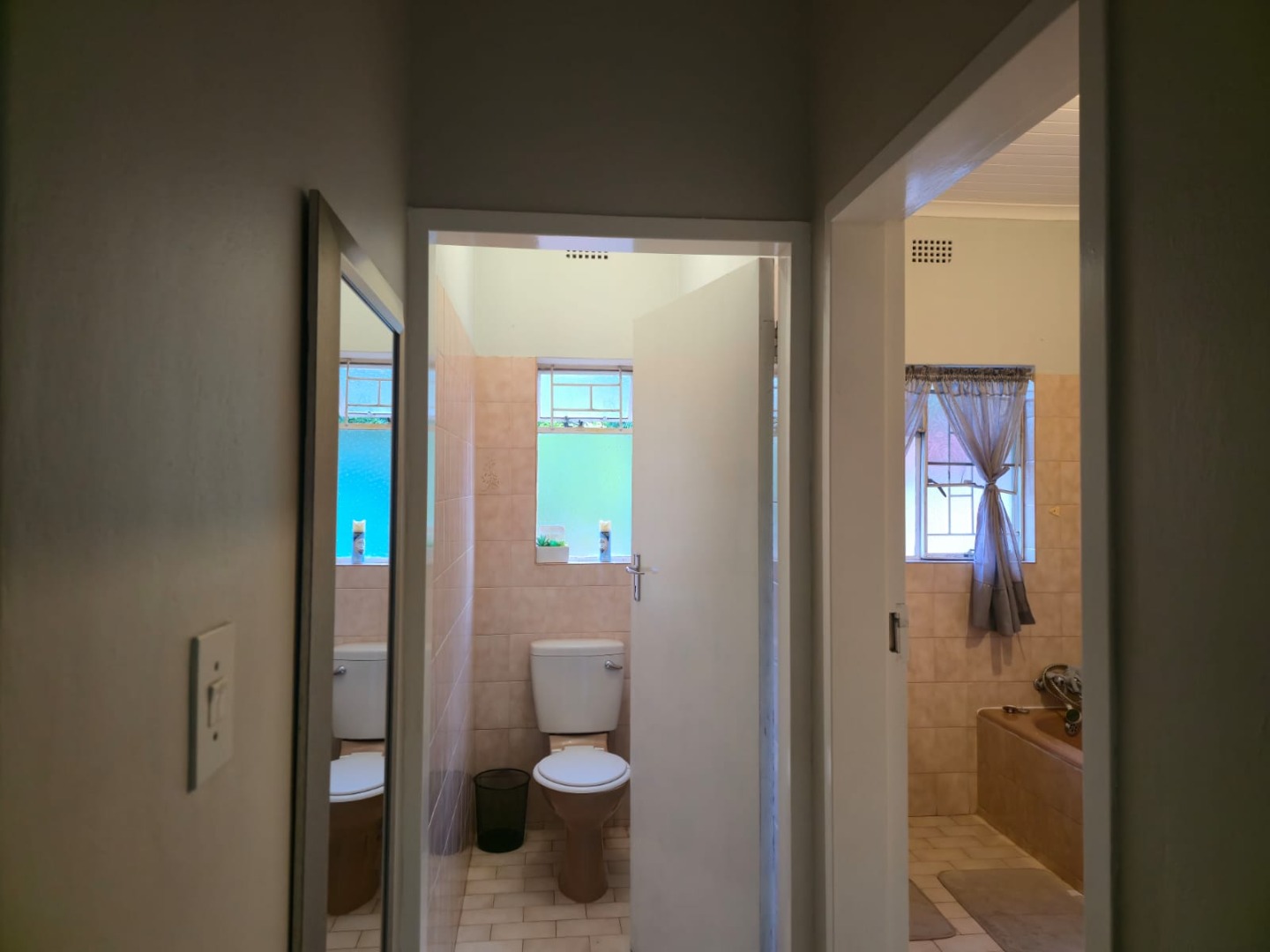 The exterior of the property presents a well-maintained facade with a tiled roof and neutral tones. Practical amenities include a double garage, security bars on windows for enhanced safety, and multiple air conditioning units to ensure comfort throughout the year. While a large green water tank offers potential water security. The property benefits from a spacious garden with mature trees and a sturdy brick boundary wall, providing a pleasant outdoor environment. An additional outside toilet adds to the home's functionality.