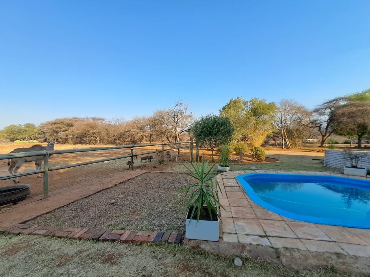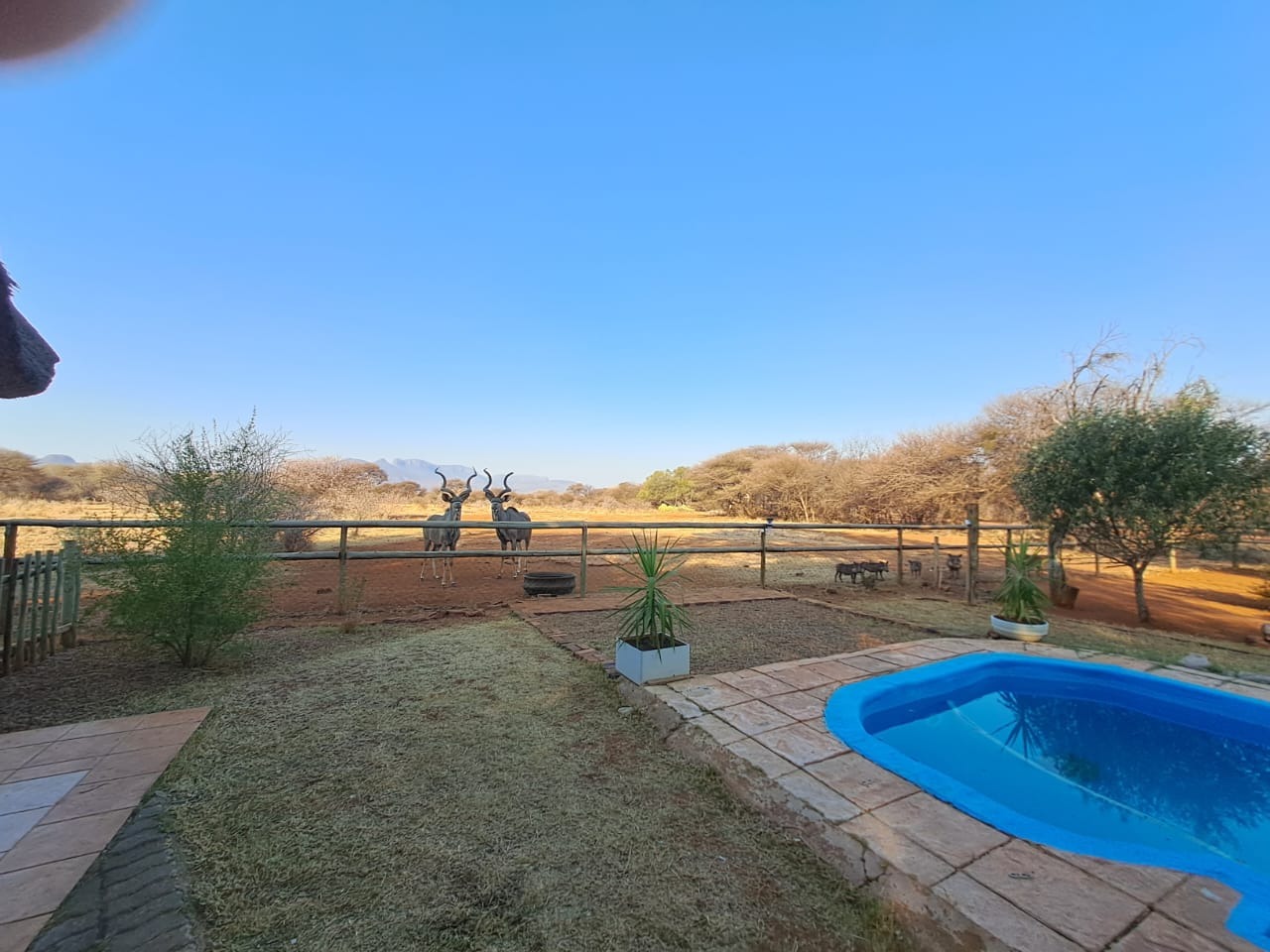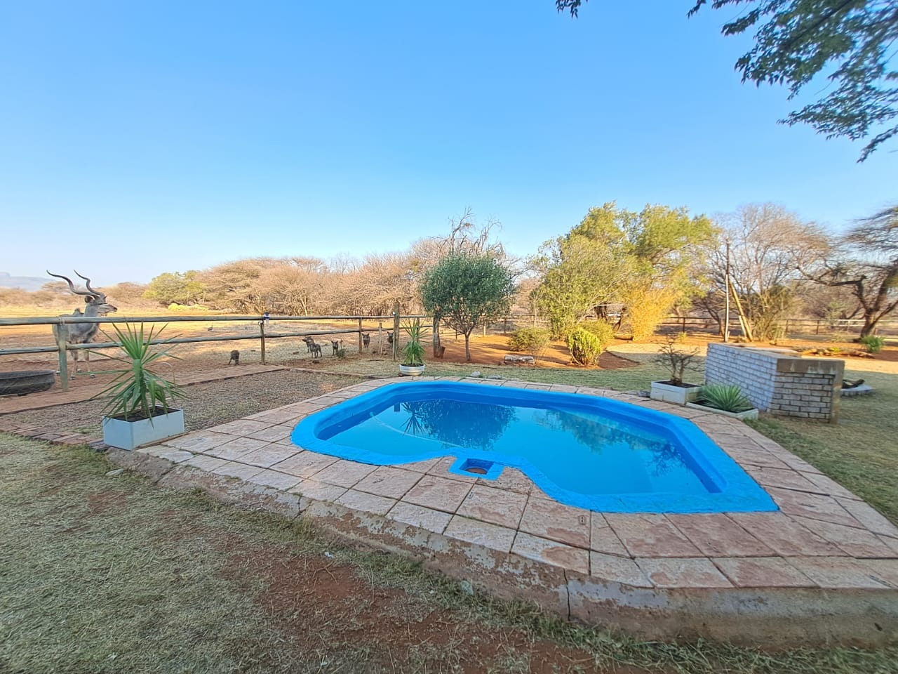 Additional features include a recently renovated swimming pool, 2 garages, 2 carports, and a Wendy house for extra storage. Enjoy spectacular mountain views and the unique experience of wildlife visiting the fence.
